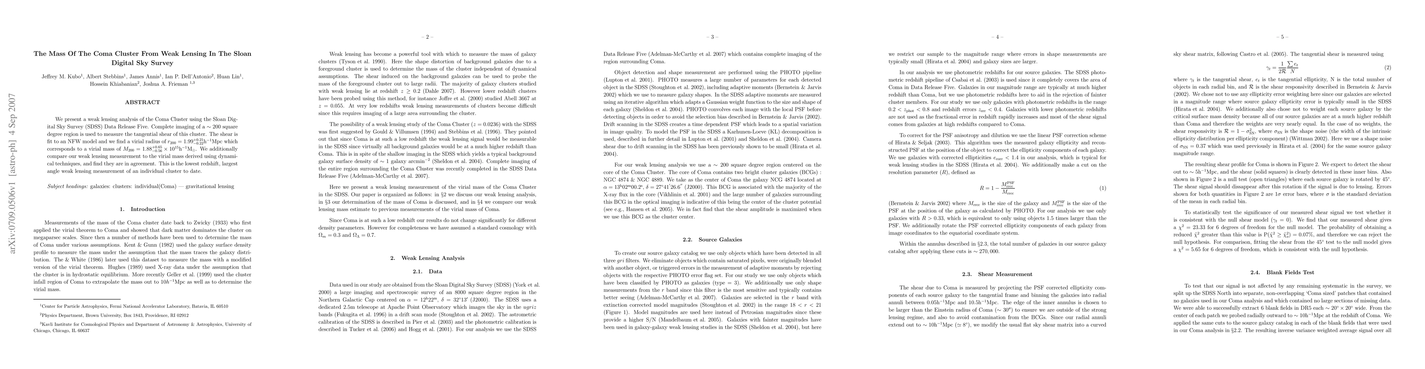 The study employs weak lensing analysis from SDSS Data Release Five to determine the mass of the Coma Cluster, finding a virial mass of \(1.88 \times 10^{15} h^{-1} M_{\odot}\), and confirms this result aligns with masses derived from dynamical techniques. This is the most extensive weak lensing measurement for an individual cluster at low redshift.