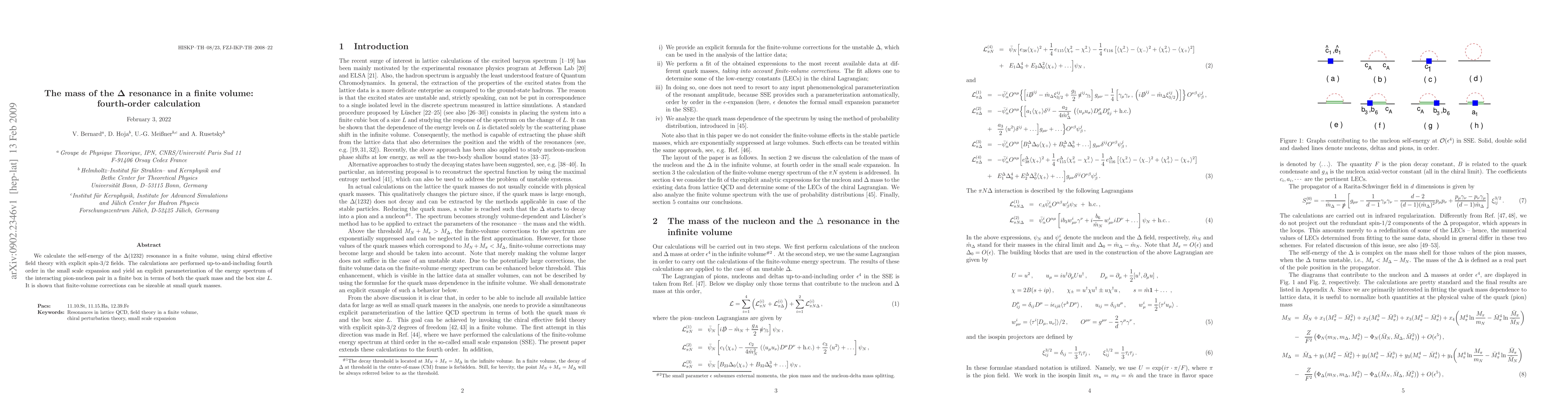 We calculate the self-energy of the Delta (1232) resonance in a finite volume, using chiral effective field theory with explicit spin-3/2 fields. The calculations are performed up-to-and-including fourth order in the small scale expansion and yield an explicit parameterization of the energy spectrum of the interacting pion-nucleon pair in a finite box in terms of both the quark mass and the box size L. It is shown that finite-volume corrections can be sizeable at small quark masses.