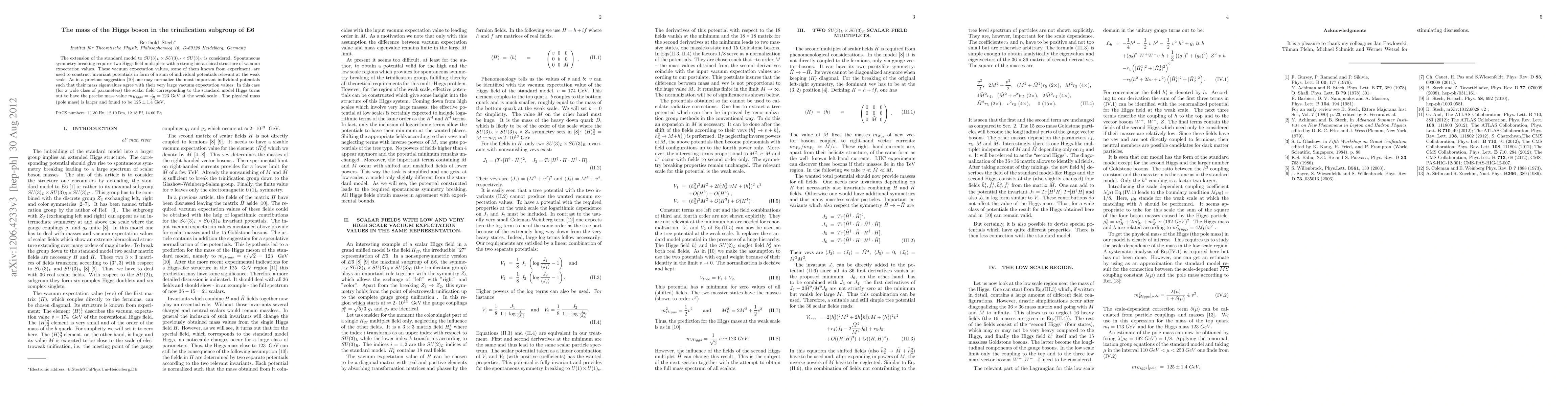 The extension of the standard model to SU(3)_L x SU(3)_R x SU(3)_C is considered. Spontaneous symmetry breaking requires two Higgs field multiplets with a strong hierarchical structure of vacuum expectation values. These vacuum expectation values, some of them known from experiment, are used to construct invariant potentials in form of a sum of individual potentials relevant at the weak scale. As in a previous suggestion one may normalize the most important individual potentials such that their mass eigenvalues agree with their very large vacuum expectation values. In this case (for a wide class of parameters) the scalar field corresponding to the standard model Higgs turns out to have the precise mass value m_Higgs = v/sqrt(2) = 123 GeV at the weak scale. The physical mass (pole mass) is larger and found to be 125 +/- 1.4 GeV.