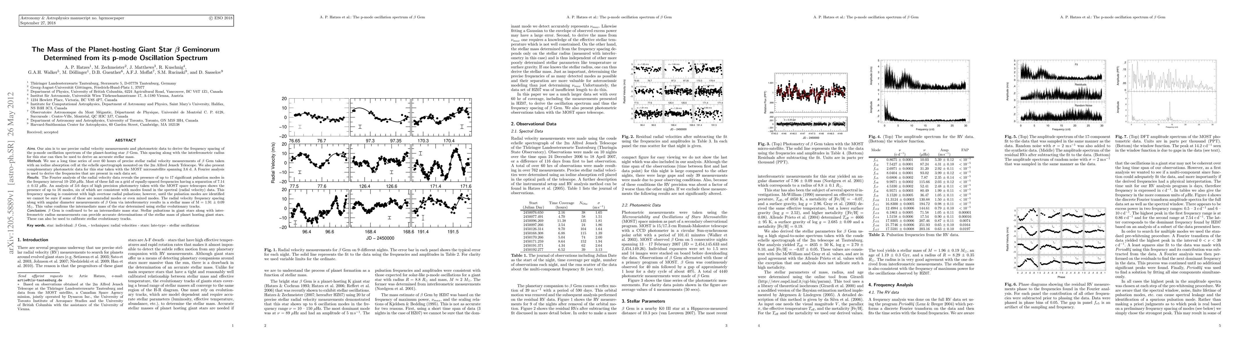 We use precise radial velocity measurements and photometric data to derive the frequency spacing of the p-mode oscillation spectrum of the planet-hosting star Beta Gem. This spacing along with the interferometric radius for this star is used to derive an accurate stellar mass. A long time series of over 60 hours of precise stellar radial velocity measurements of Beta Gem were taken with an iodine absorption cell and the echelle spectrograph mounted on the 2m Alfred Jensch Telescope. Complementary photometric data for this star were also taken with the MOST microsatellite spanning 3.6 d. A Fourier analysis of the radial velocity data reveals the presence of up to 17 significant pulsation modes in the frequency interval 10-250 micro-Hz. Most of these fall on a grid of equally-spaced frequencies having a separation of 7.14 +/- 0.12 micro-Hz. An analysis of 3.6 days of high precision photometry taken with the MOST space telescope shows the presence of up to 16 modes, six of which are consistent with modes found in the spectral (radial velocity) data. This frequency spacing is consistent with high overtone radial pulsations; however, until the pulsation modes are identified we cannot be sure if some of these are nonradial modes or even mixed modes. The radial velocity frequency spacing along with angular diameter measurements of Beta Gem via interferometry results in a stellar mass of M = 1.91 +/- 0.09 solar masses. This value confirms the intermediate mass of the star determined using stellar evolutionary tracks. Beta Gem is confirmed to be an intermediate mass star. Stellar pulsations in giant stars along with interferometric radius measurements can provide accurate determinations of the stellar mass of planet hosting giant stars. These can also be used to calibrate stellar evolutionary tracks.