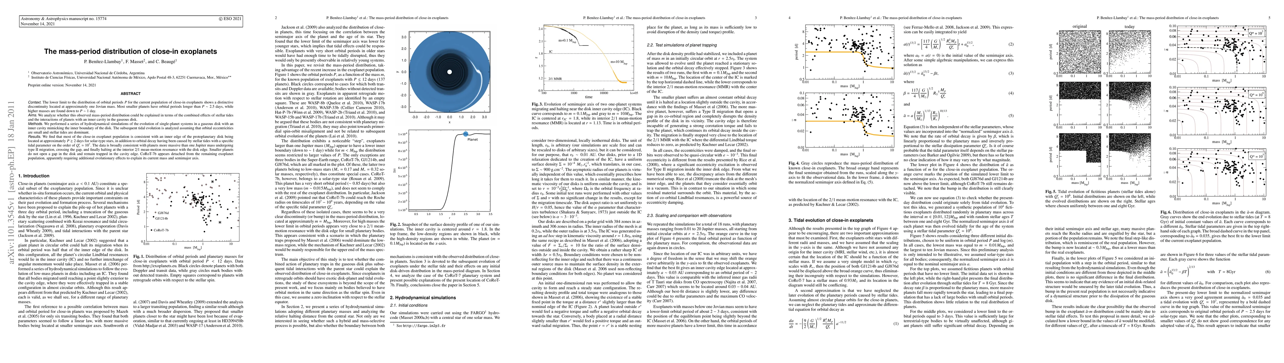 This paper investigates the mass-period distribution of close-in exoplanets, finding a discontinuity at one Jovian mass with smaller planets having longer orbital periods. The study uses hydrodynamical simulations to suggest that stellar tides and disk interactions explain the observed distribution, with larger planets undergoing type II migration and smaller ones remaining in a disk cavity.
