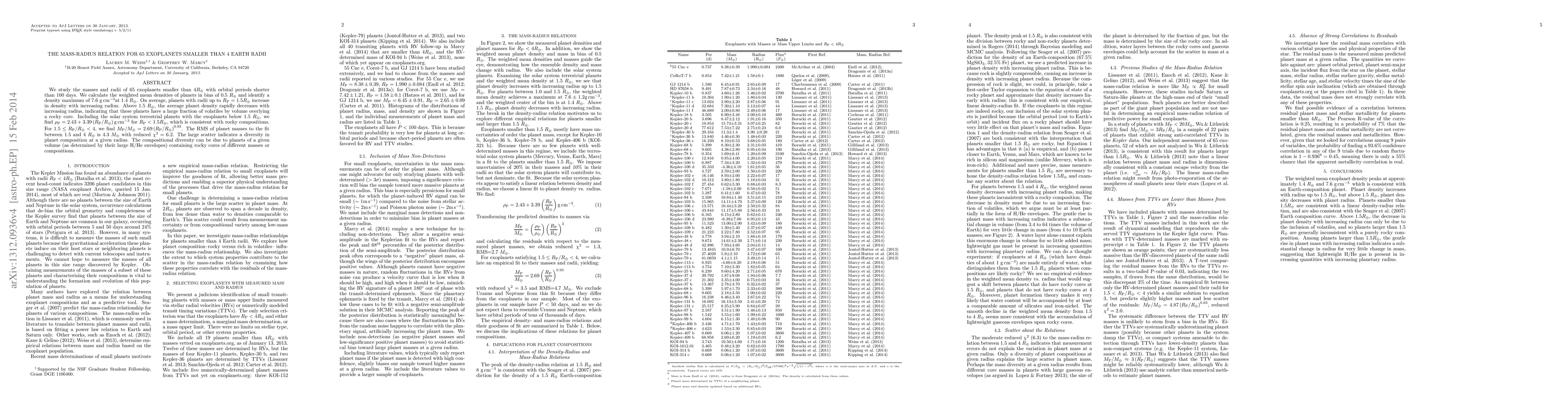 This study investigates the mass-radius relation for 65 exoplanets smaller than 4 Earth radii, finding a density peak at 1.4 Earth radii. Planets below 1.5 Earth radii show increasing density with radius, suggesting rocky compositions, while larger planets exhibit decreasing density, indicating a high volatile content.