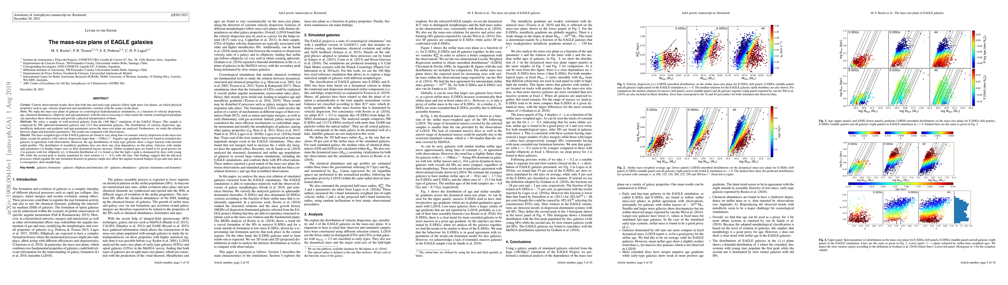 Current observational results show that both late-and-early-type galaxies follow tight mass-size planes, on which physical properties such as age, velocity dispersion and metallicities correlate with the scatter on the plane. We study the mass-size plane of galaxies in cosmological hydrodynamical simulations, as a function of velocity dispersion, age, chemical abundances, ellipticity and spin parameters with the aim at assessing to what extent the current cosmological paradigm can reproduce these observations and provide a physical interpretation of them. We select a sample of well-resolved galaxies from the (100 Mpc)^3 simulation of the EAGLE Project. This sample is composed by 508 spheroid-dominated galaxies and 1213 disc-dominated galaxies. The distributions of velocity dispersion, age, metallicity indicators and gradients and spin parameters across the mass-size plane are analysed. Furthermore, we study the relation between shape and kinematic parameters. The results are compared with observations. The mass-weighted ages of the EAGLE galaxies are found to vary along lines of constant velocity dispersion on the mass-size plane, except for galaxies with velocity dispersion larger than aprox 150 km s^(-1) . Negative age gradients tend to be found in extended disc galaxies in agreement with observations. However, the age distributions of early-type galaxies show a larger fraction with inverted radial profiles. The distribution of metallicity gradients does not show any clear dependence on this plane. Galaxies with similar spin parameters ({\lambda}) display larger sizes as their dynamical masses increase. Stellar-weighted ages are found to be good proxies for {\lambda} in galaxies with low ellipticity ({\epsilon}). Abridged