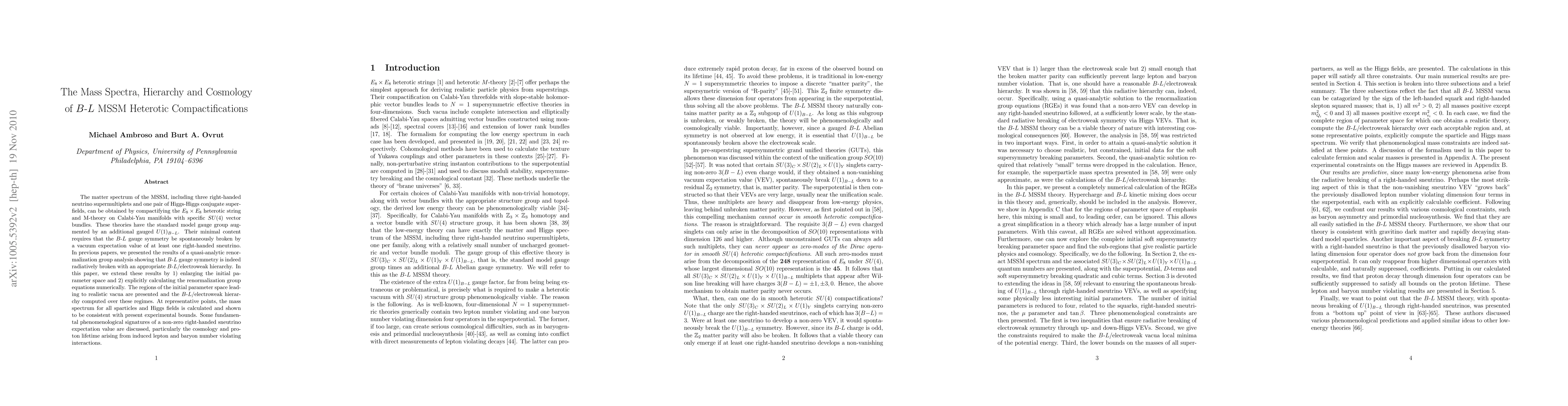 This paper explores the mass spectra, hierarchy, and cosmology of B-L MSSM heterotic compactifications in string theory, showing that radiative breaking of B-L symmetry is feasible with a realistic parameter space. It calculates the mass spectra of sparticles and Higgs fields consistent with experimental bounds and discusses implications for cosmology and proton decay.