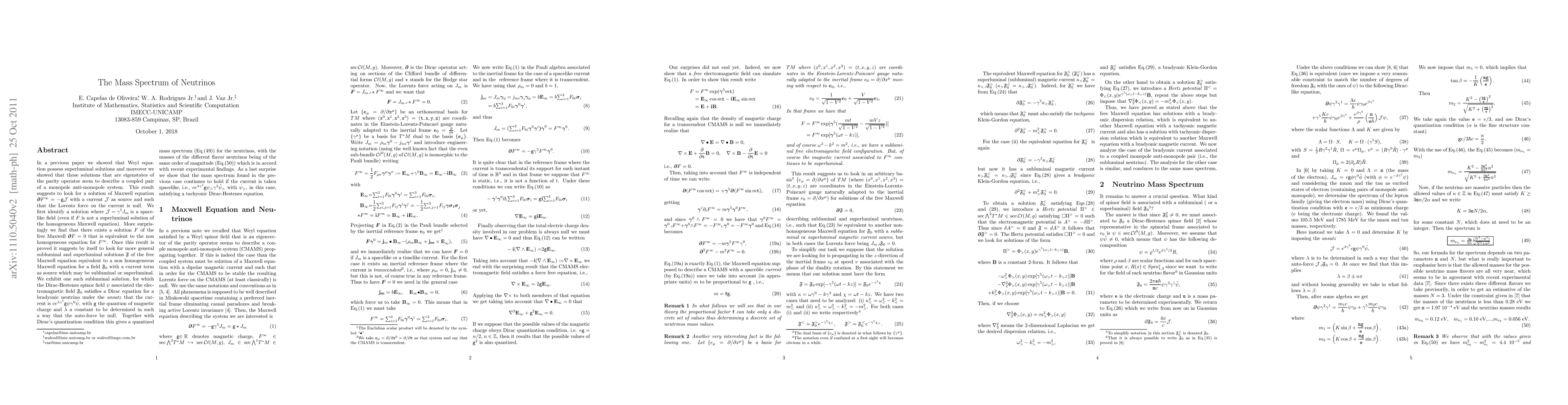 In a previous paper we showed that Weyl equation possess superluminal solutions and moreover we showed that those solutions that are eigenstates of the parity operator seem to describe a coupled pair of a monopole anti-monopole system. This result suggests to look for a solution of Maxwell equation \partialF^{\infty}=-gJ with a current J as source and such that the Lorentz force on the current is null. We first identify a solution where J={\gamma}^{5}J_{m}is a spacelike field (even if F is not a superluminal solution of the homogeneous Maxwell equation). More surprisingly we find that there exists a solution F of the free Maxwell \partialF=0 that is equivalent to the non homogeneous equation for F^{\infty}. Once this result is proved it suggests by itself to look for more general subluminal and superluminal solutions F of the free Maxwell equation equivalent to a non homogeneous Maxwell equation for a field F_{0} with a current term as source which may be subluminal or superluminal. We exhibit one such subluminal solution, for which the Dirac-Hestenes spinor field {\psi} associated the electromagnetic field F_{0} satisfies a Dirac equation for a bradyonic neutrino under the ansatz that the current is ce^{{\lambda}{\gamma}^{5}}g{\psi}{\gamma}^{0}{\psi}, with g the quantum of magnetic charge and {\lambda} a constant to be determined in such a way that the auto-force be null. Together with Dirac's quantization condition this gives a quantized mass spectrum (Eq.49) for the neutrinos, with the masses of the different flavor neutrinos being of the same order of magnitude (Eq.50) which is in accord with recent experimental findings. As a last surprise we show that the mass spectrum found in the previous case continues to hold if the current is taken spacelike, i.e., ce^{{\lambda}{\gamma}^{5}}g{\psi}_{>}{\gamma}^{3}{\psi}_{>} with {\psi}_{>}, in this case, satisfying a tachyonic Dirac-Hestenes equation.