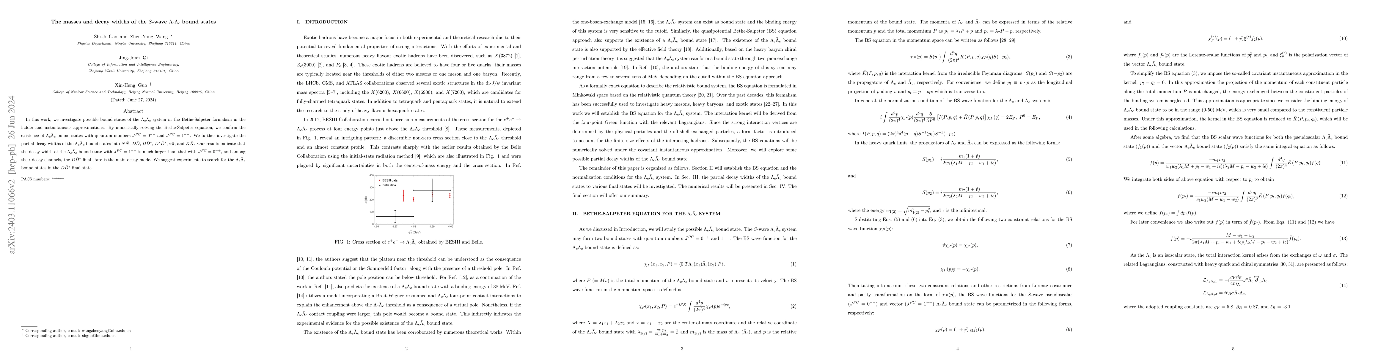 In this work, we investigate possible bound states of the $\Lambda_c\bar{\Lambda}_c$ system in the Bethe-Salpeter formalism in the ladder and instantaneous approximations. By numerically solving the Bethe-Salpeter equation, we confirm the existence of $\Lambda_c\bar{\Lambda}_c$ bound states with quantum numbers $J^{PC}=0^{-+}$ and $J^{PC}=1^{--}$. We further investigate the partial decay widths of the $\Lambda_c\bar{\Lambda}_c$ bound states into $N\bar{N}$, $D\bar{D}$, $D\bar{D}^\ast$, $D^\ast\bar{D}^\ast$, $\pi\bar{\pi}$, and $K\bar{K}$. Our results indicate that the decay width of the $\Lambda_c\bar{\Lambda}_c$ bound state with $J^{PC}=1^{--}$ is much larger than that with $J^{PC}=0^{-+}$, and among their decay channels, the $D\bar{D}^\ast$ final state is the main decay mode. We suggest experiments to search for the $\Lambda_c\bar{\Lambda}_c$ bound states in the $D\bar{D}^\ast$ final state.