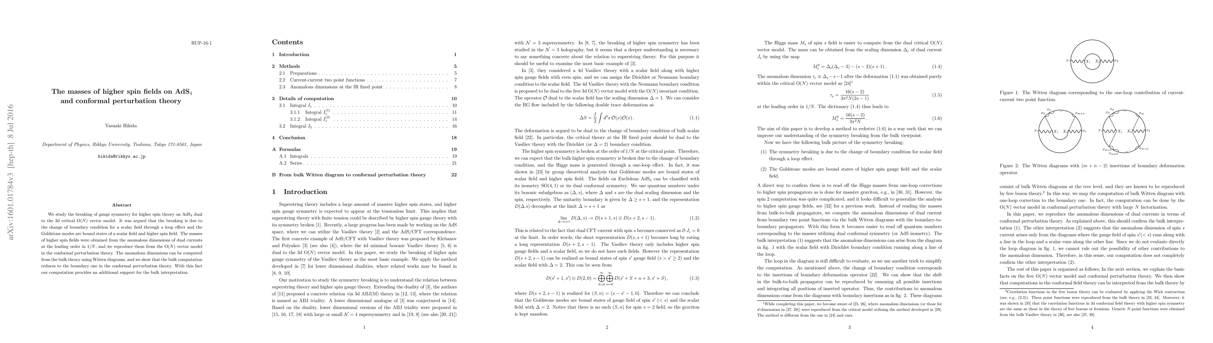 This paper investigates the gauge symmetry breaking in higher spin theory on AdS_4, linked to the 3d O(N) vector model, attributing the breaking to scalar field boundary condition changes via loop effects. The study derives masses for higher spin fields from conformal perturbation theory and confirms these results using Witten diagrams in the bulk theory.
