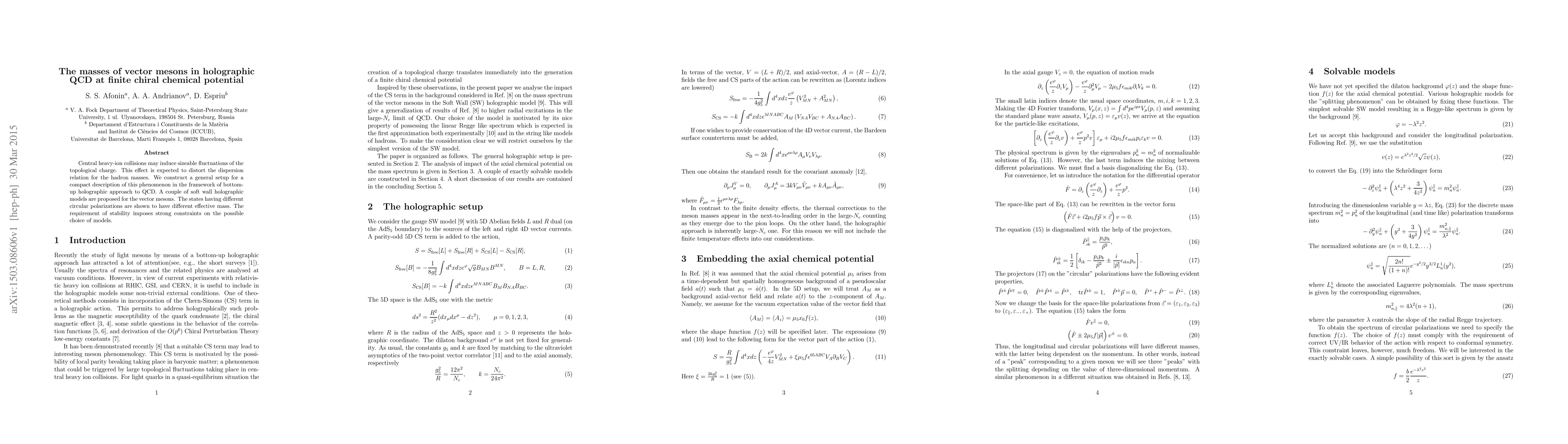 Central heavy-ion collisions may induce sizeable fluctuations of the topological charge. This effect is expected to distort the dispersion relation for the hadron masses. We construct a general setup for a compact description of this phenomenon in the framework of bottom-up holographic approach to QCD. A couple of soft wall holographic models are proposed for the vector mesons. The states having different circular polarizations are shown to have different effective mass. The requirement of stability imposes strong constraints on the possible choice of models.
