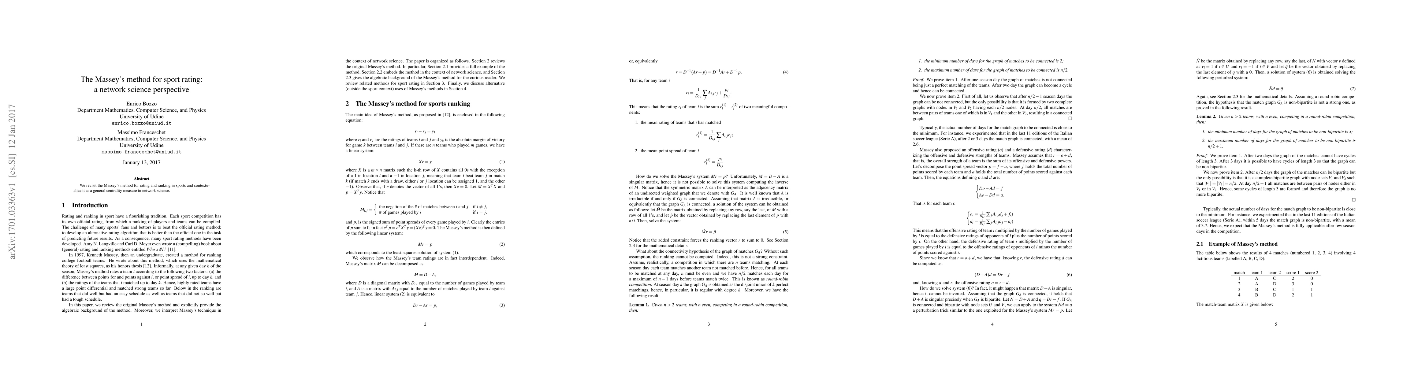 We revisit the Massey's method for rating and ranking in sports and contextualize it as a general centrality measure in network science.