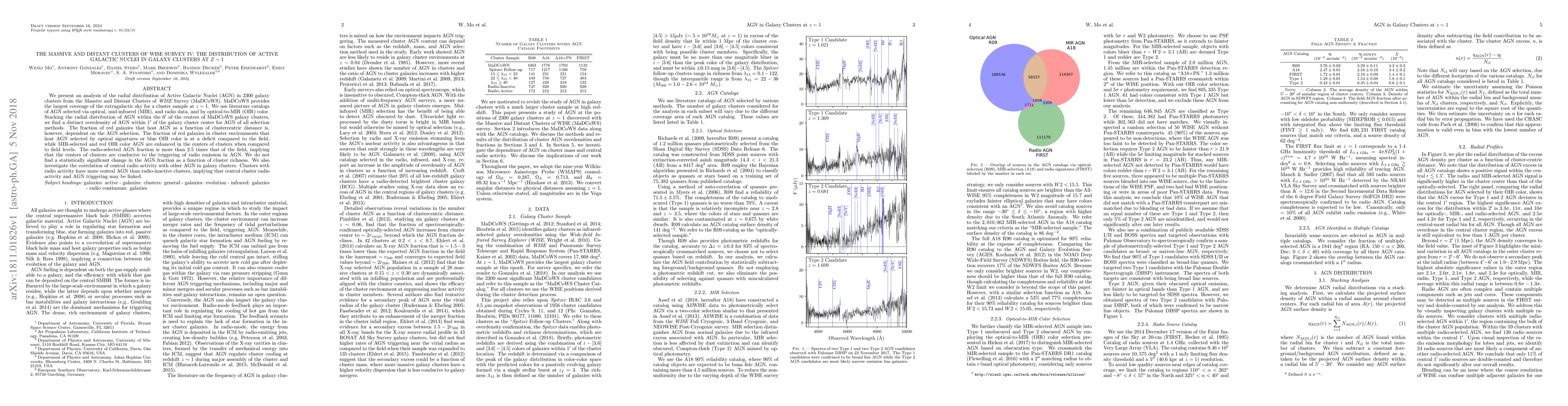 We present an analysis of the radial distribution of Active Galactic Nuclei (AGN) in $2300$ galaxy clusters from the Massive and Distant Clusters of {\it WISE} Survey (MaDCoWS). MaDCoWS provides the largest coverage of the extragalactic sky for a cluster sample at $z\sim1$. We use literature catalogs of AGN selected via optical, mid-infrared (MIR), and radio data, and by optical-to-MIR (OIR) color. Stacking the radial distribution of AGN within the $6\arcmin$ of the centers of MaDCoWS galaxy clusters, we find a distinct overdensity of AGN within $1\arcmin$ of the galaxy cluster center for AGN of all selection methods. The fraction of red galaxies that host AGN as a function of clustercentric distance is, however, dependent on the AGN selection. The fraction of red galaxies in cluster environments that host AGN selected by optical signatures or blue OIR color is at a deficit compared to the field, while MIR-selected and red OIR color AGN are enhanced in the centers of clusters when compared to field levels. The radio-selected AGN fraction is more than $2.5$ times that of the field, implying that the centers of clusters are conducive to the triggering of radio emission in AGN. We do not find a statistically significant change in the AGN fraction as a function of cluster richness. We also investigate the correlation of central radio activity with other AGN in galaxy clusters. Clusters with radio activity have more central AGN than radio-inactive clusters, implying that central cluster radio activity and AGN triggering may be linked.