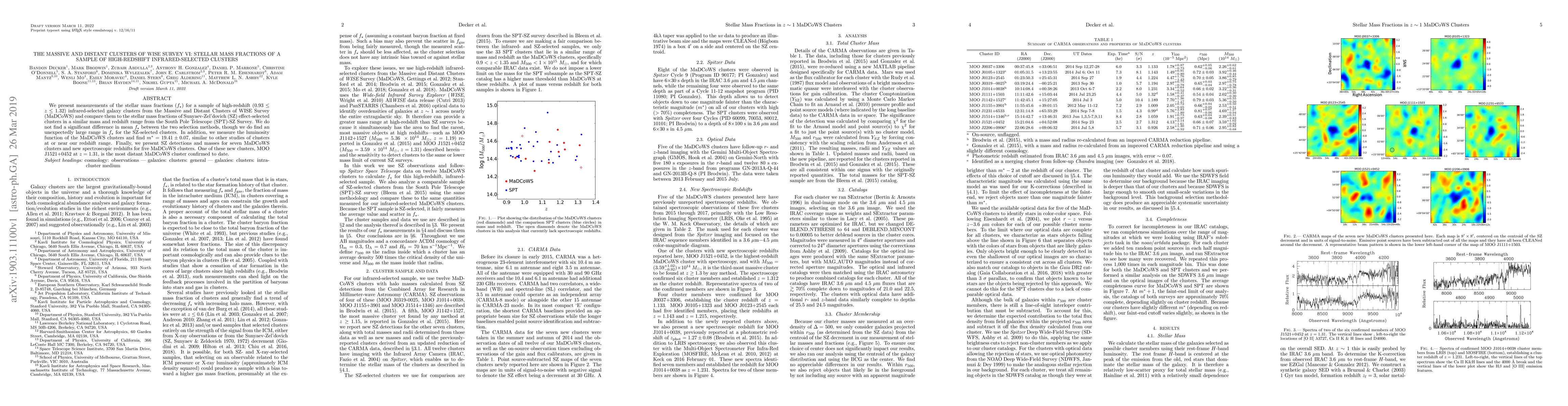This paper investigates stellar mass fractions of high-redshift ($0.93 \le z \le 1.32$) infrared-selected clusters from the MaDCoWS survey, finding no significant difference compared to SZ-selected clusters, despite a large range in the latter. It also reports new spectroscopic redshifts and SZ detections for several clusters, including the most distant MaDCoWS cluster to date.