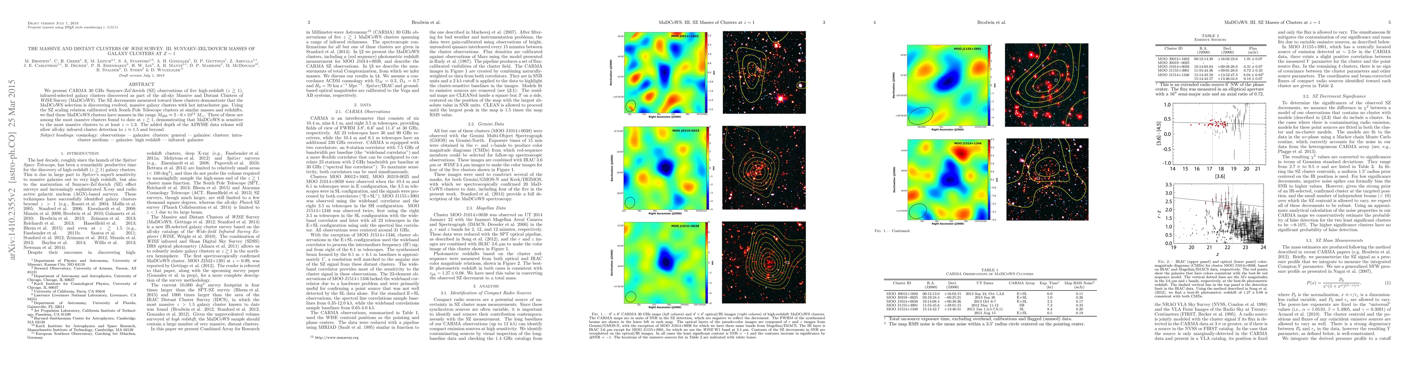 This paper reports on CARMA observations of five high-redshift galaxy clusters discovered by the MaDCoWS survey, finding them to be massive and evolved with intracluster gas masses ranging from $2-6 \times 10^{14}$ $M_\odot$. These clusters are among the most massive found at $z\gtrsim 1$, indicating MaDCoWS's capability to detect such clusters up to $z = 1.3$.