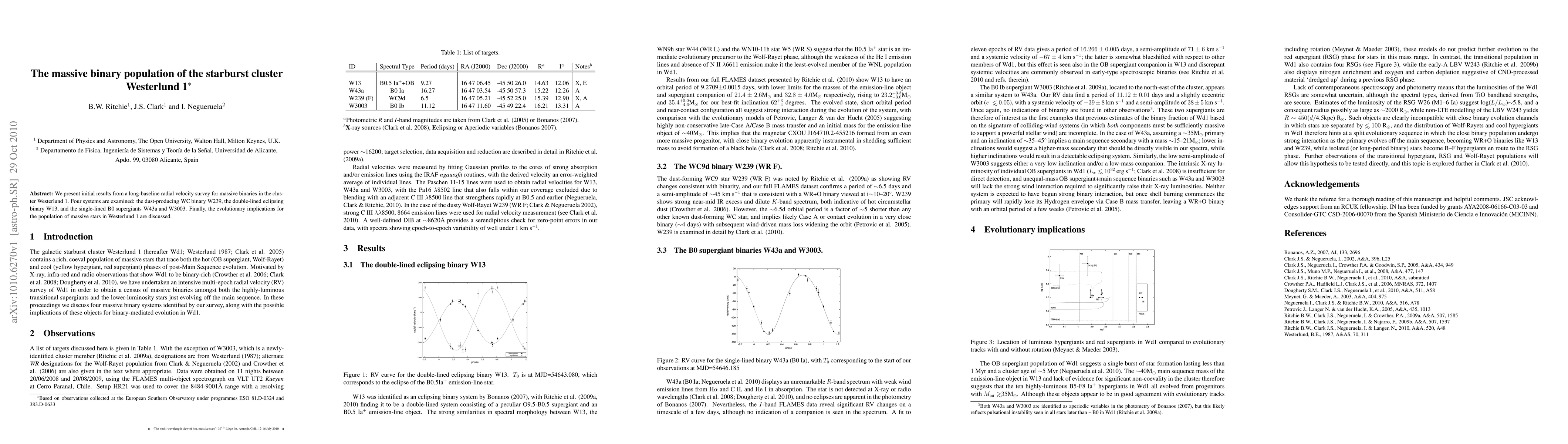 This study investigates the massive binary systems in the starburst cluster Westerlund 1, focusing on four systems: WC binary W239, eclipsing binary W13, and supergiants W43a and W3003. The findings provide insights into the evolutionary dynamics of massive stars within this cluster.