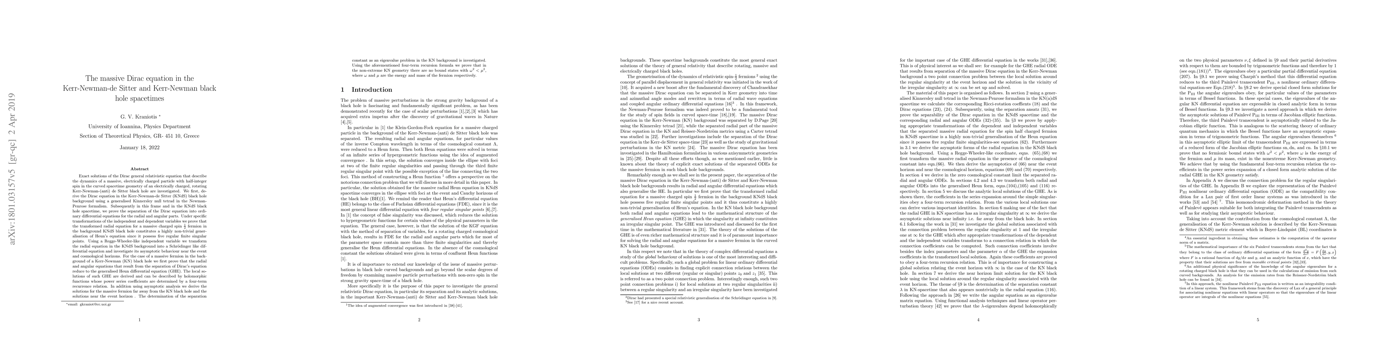 Exact solutions of the Dirac general relativistic equation (DE) that describe the dynamics of a massive, electrically charged particle with half-integer spin in the curved spacetime geometry of an electrically charged, rotating Kerr-Newman-(anti) de Sitter black hole (BH) are investigated. We first, derive the DE in the Kerr-Newman-de Sitter (KNdS) BH background using a generalised Kinnersley null tetrad in the Newman-Penrose formalism. In this frame, we prove the separation of the DE into ordinary differential equations for the radial and angular parts. Under specific transformations of the independent and dependent variables we prove that the transformed radial equation for a massive charged spin $\frac{1}{2}$ fermion in the background KNdS BH constitutes a highly non-trivial generalisation of Heun's equation. Using a Regge-Wheeler-like independent variable we transform the radial equation in the KNdS background into a Schr\"{o}dinger-like differential equation and investigate its asymptotic behaviour near the event and cosmological horizons. For a massive fermion (MF) in the background of a Kerr-Newman (KN) BH we first prove that the radial and angular equations that result from the separation of DE reduce to the generalised Heun differential equation (GHE). The local solutions of such GHE are derived and can be described by holomorphic functions whose power series coefficients are determined by a four-term recurrence relation. Using asymptotic analysis we derive the solutions for the MF far away from the KN BH and the solutions near the event horizon . The determination of the separation constant as an eigenvalue problem in the KN background is investigated. Using the aforementioned four-term recursion formula we prove that in the non-extreme KN geometry there are no bound states with $\omega^2<\mu^2$, where $\omega$ and $\mu$ are the energy and mass of the fermion respectively.