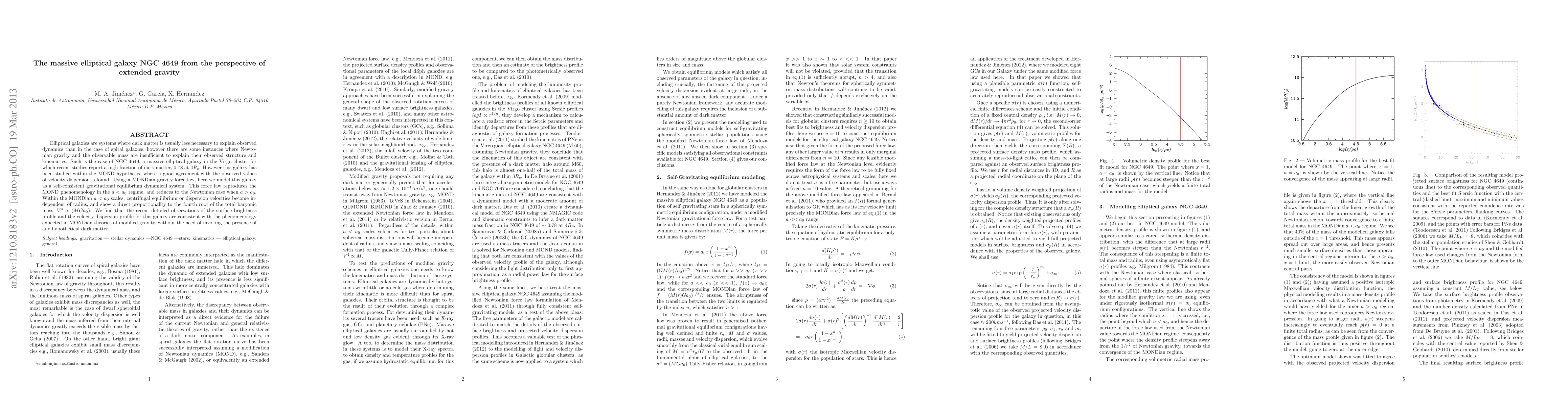 This paper explores the dynamics of the massive elliptical galaxy NGC 4649 using the Modified Newtonian Dynamics (MOND) framework, finding that MOND's gravity force law can explain its observed structure and kinematics without invoking dark matter. The study shows that MOND's predictions align well with the galaxy's observed surface brightness and velocity dispersion profiles.