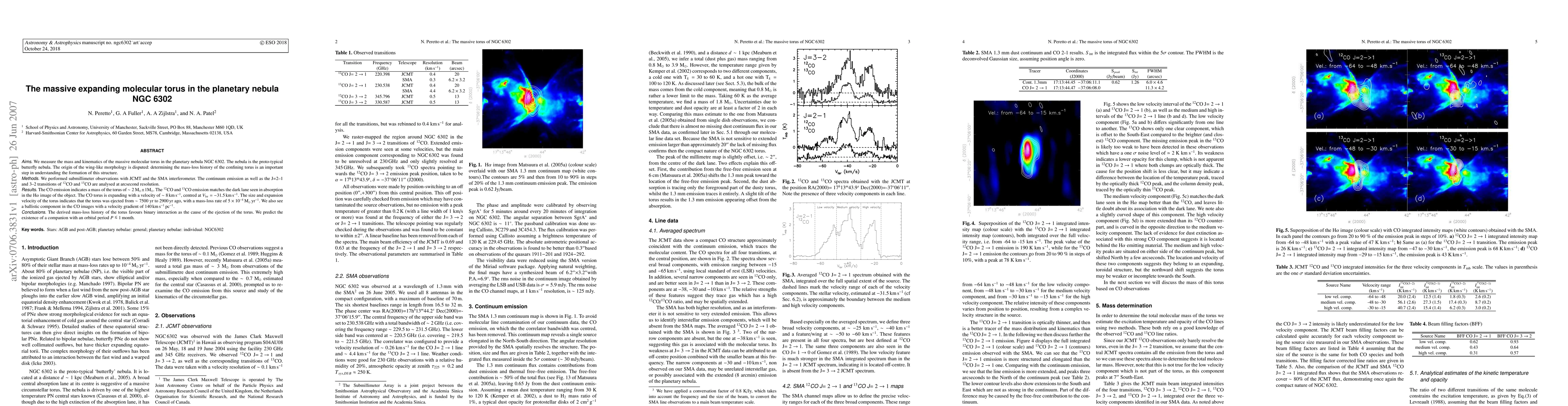 We measure the mass and kinematics of the massive molecular torus in the planetary nebula NGC 6302. The nebula is the proto-typical butterfly nebula. The origin of the wing-like morphology is disputed: determining the mass-loss history of the confining torus is an important step in understanding the formation of this structure. We performed submillimeter observations with JCMT and the SMA interferometer. The continuum emission as well as the J=2-1 and 3-2 transitions of 12CO and 13CO are analysed at arcsecond resolution. The CO emission indicates a mass of the torus of ~ 2Msun +/- 1Msun. The 12CO and 13CO emission matches the dark lane seen in absorption in the Halpha image of the object. The CO torus is expanding with a velocity of ~ 8 km/s, centred at Vlsr=-31.5 km/s. The size and expansion velocity of the torus indicates that the torus was ejected from ~ 7500 yr to 2900 yr ago, with a mass-loss rate of 5x10^{-4}Msun/yr. We also see a ballistic component in the CO images with a velocity gradient of 140 km/s/pc. The derived mass-loss history of the torus favours binary interaction as the cause of the ejection of the torus. We predict the existence of a companion with an orbital period P < 1 month.