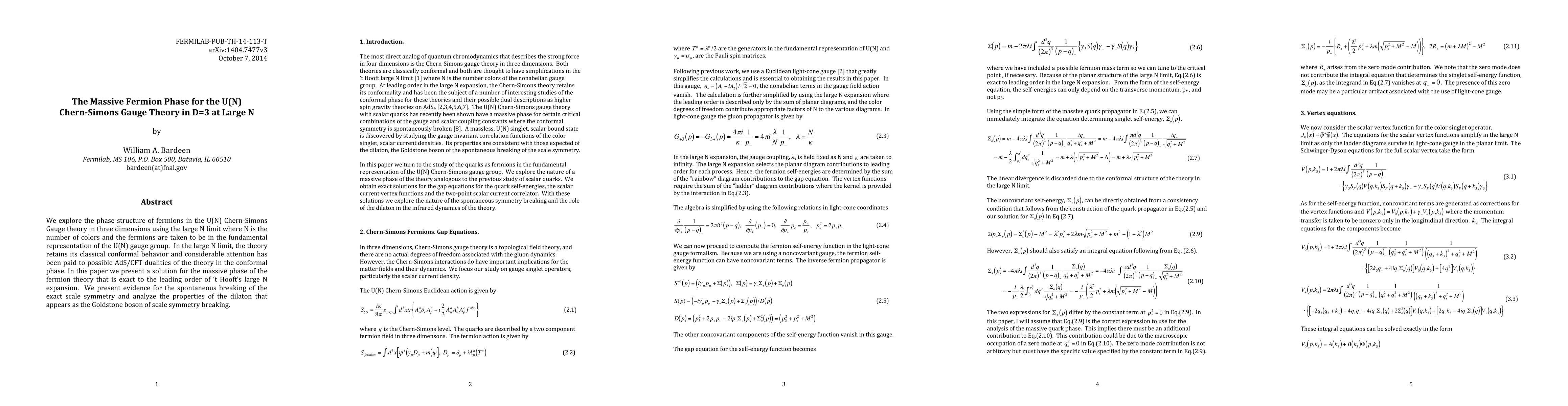 This paper investigates the phase structure of fermions in U(N) Chern-Simons gauge theory in three dimensions using the large N limit, revealing a solution for the massive fermion phase exact to the leading order of 't Hooft's large N expansion. It provides evidence for the spontaneous breaking of scale symmetry and analyzes the properties of the resulting dilation Goldstone boson.