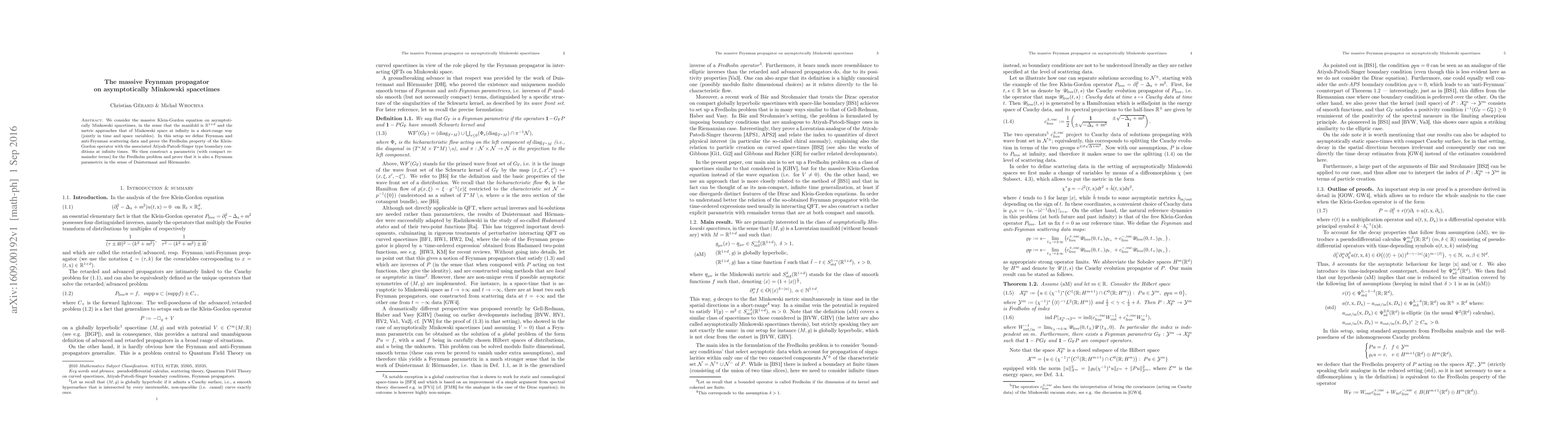 This paper studies the massive Klein-Gordon equation on asymptotically Minkowski spacetimes, defining Feynman and anti-Feynman scattering data and proving the Fredholm property of the operator under Atiyah-Patodi-Singer boundary conditions. It constructs a parametrix for the Fredholm problem, demonstrating its role as a Feynman parametrix.