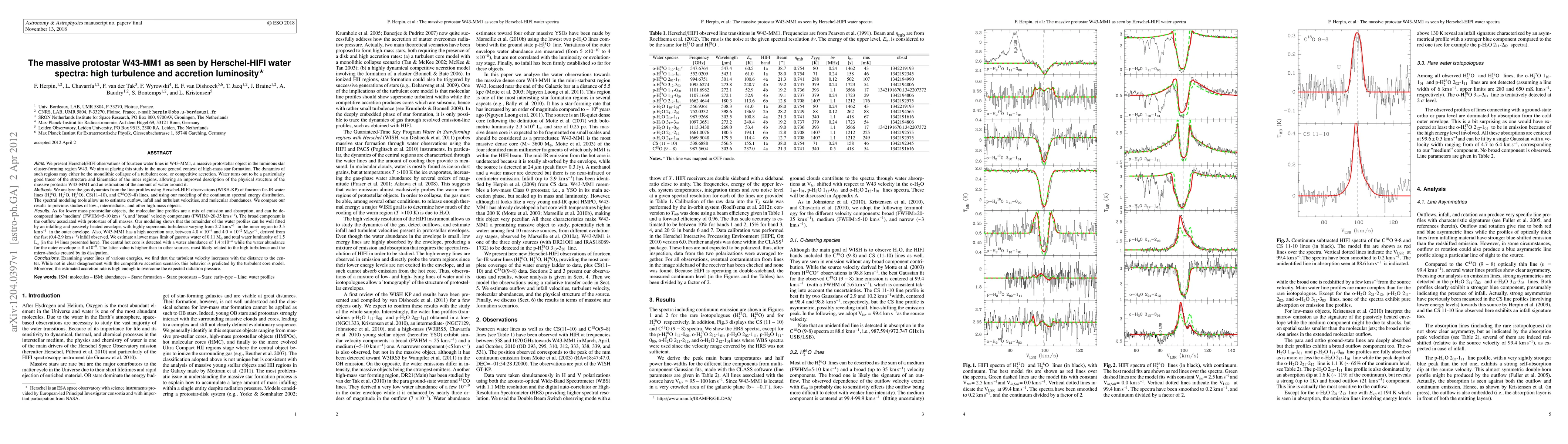 This paper presents Herschel-HIFI observations of water lines in W43-MM1, revealing high turbulence and accretion luminosity. The study finds highly supersonic turbulence and a high accretion rate, suggesting a turbulent core model and supporting the idea that the accretion rate can overcome radiation pressure.