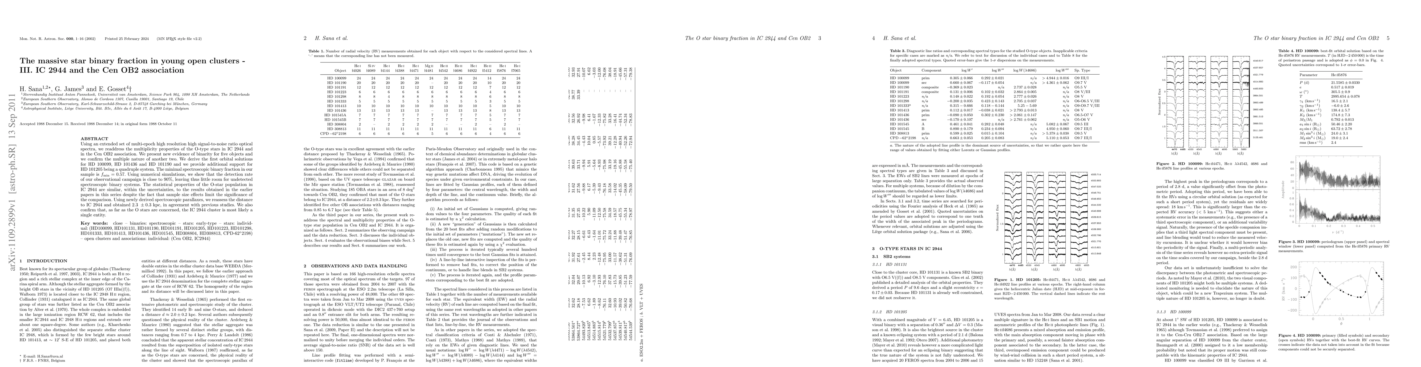 Using an extended set of multi-epoch high-resolution high signal-to-noise ratio optical spectra, we readdress the multiplicity properties of the O-type stars in IC 2944 and in the Cen OB2 association. We present new evidence of binarity for five objects and we confirm the multiple nature of another two. We derive the first orbital solutions for HD 100099, HD 101436 and HD 101190 and we provide additional support for HD 101205 being a quadruple system. The minimal spectroscopic binary fraction in our sample is f_min = 0.57. Using numerical simulations, we show that the detection rate of our observational campaign is close to 90 per cent, leaving thus little room for undetected spectroscopic binary systems. The statistical properties of the O-star population in IC 2944 are similar, within the uncertainties, to the results obtained in the earlier papers in this series despite the fact that sample size effects limit the significance of the comparison. Using newly derived spectroscopic parallaxes, we reassess the distance to IC 2944 and obtained 2.3+/-0.3 kpc, in agreement with previous studies. We also confirm that, as far as the O stars are concerned, the IC 2944 cluster is most likely a single entity.