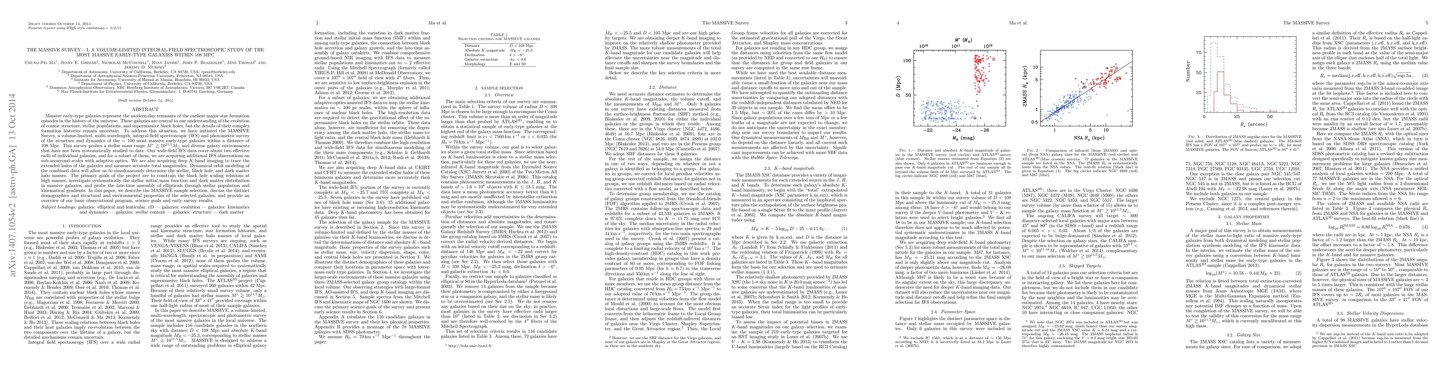 The MASSIVE Survey aims to study the most massive early-type galaxies within 108 Mpc using integral-field spectroscopy and deep imaging to investigate their formation histories, stellar populations, and dark matter distribution. The survey seeks to constrain black hole scaling relations and explore the late-time assembly of elliptical galaxies.