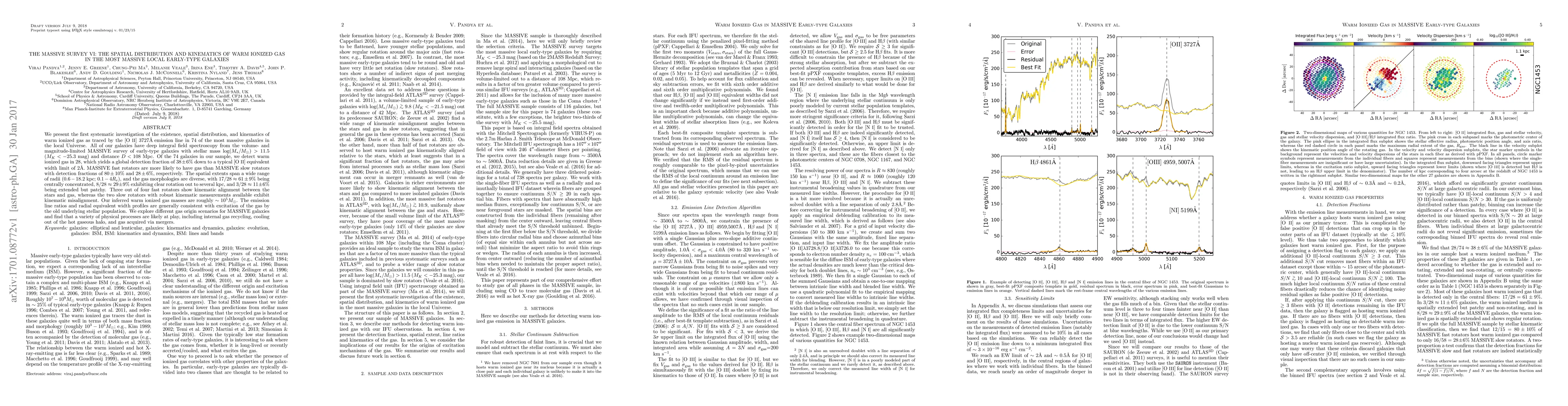 We present the first systematic investigation of the existence, spatial distribution, and kinematics of warm ionized gas as traced by the [O II] 3727AA emission line in 74 of the most massive galaxies in the local Universe. All of our galaxies have deep integral field spectroscopy from the volume- and magnitude-limited MASSIVE survey of early-type galaxies with stellar mass log(M_*/M_sun) > 11.5 (M_K < -25.3 mag) and distance D < 108 Mpc. Of the 74 galaxies in our sample, we detect warm ionized gas in 28, which yields a global detection fraction of 38\pm6% down to a typical [O II] equivalent width limit of 2AA. MASSIVE fast rotators are more likely to have gas than MASSIVE slow rotators with detection fractions of 80\pm10% and 28\pm6%, respectively. The spatial extents span a wide range of radii (0.6 - 18.2 kpc; 0.1 - 4R_e), and the gas morphologies are diverse, with 17/28 = 61\pm9% being centrally concentrated, 8/28 = 29\pm9% exhibiting clear rotation out to several kpc, and 3/28 = 11\pm6% being extended but patchy. Three out of four fast rotators show kinematic alignment between the stars and gas, whereas the two slow rotators with robust kinematic measurements available exhibit kinematic misalignment. Our inferred warm ionized gas masses are roughly ~10^5M_sun. The emission line ratios and radial equivalent width profiles are generally consistent with excitation of the gas by the old underlying stellar population. We explore different gas origin scenarios for MASSIVE galaxies and find that a variety of physical processes are likely at play, including internal gas recycling, cooling out of the hot gaseous halo, and gas acquired via mergers.