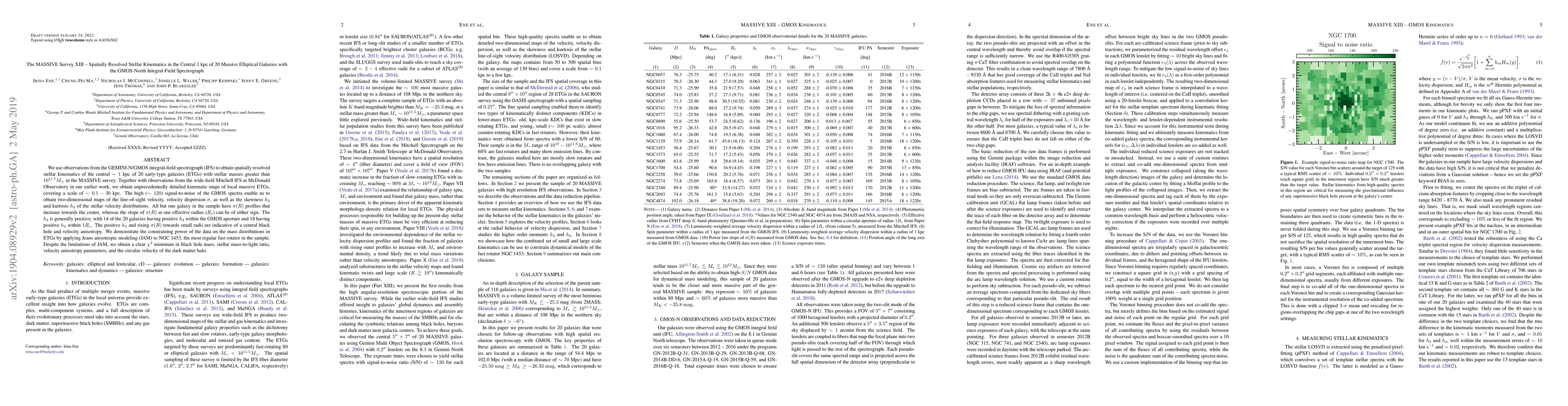 This paper presents spatially resolved stellar kinematics for 20 massive elliptical galaxies using GMOS-North IFS, revealing rising velocity dispersion towards the center and positive kurtosis indicative of central black holes and velocity anisotropy. The study demonstrates the power of the data for constraining mass distributions in these galaxies.
