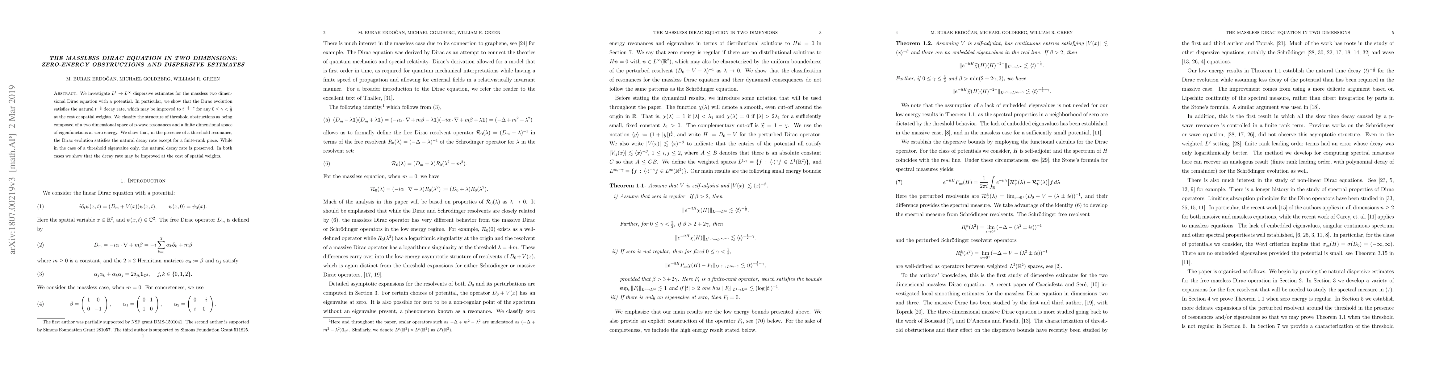 This paper investigates dispersive estimates for the massless Dirac equation in two dimensions with a potential, revealing a $t^{-\frac12}$ decay rate for the Dirac evolution. It classifies zero-energy obstructions into p-wave resonances and eigenfunctions, showing that the natural decay rate is preserved unless a threshold resonance exists, in which case it is only slightly disrupted.