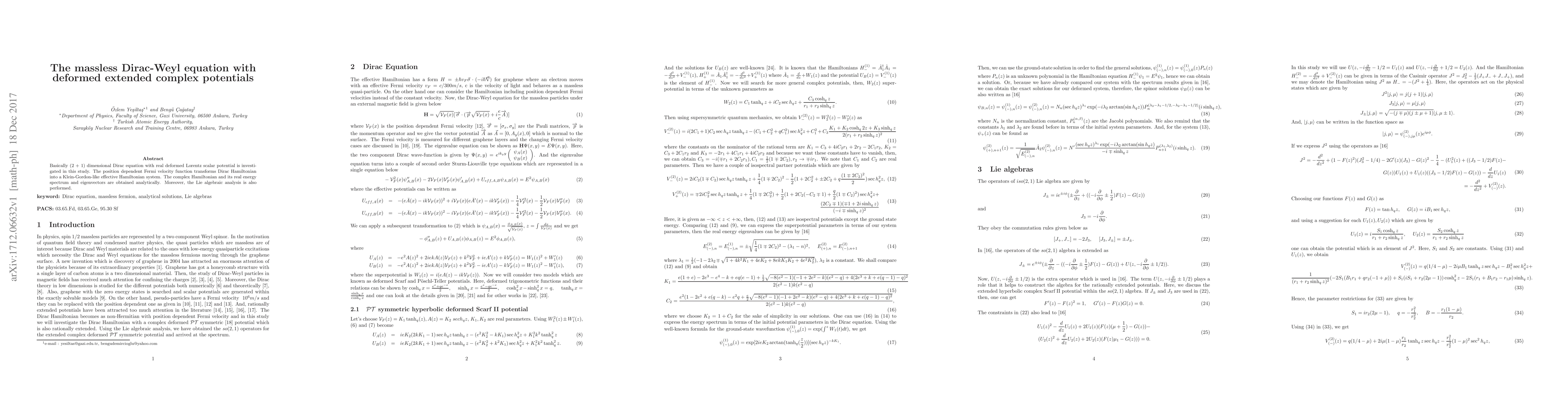 This paper investigates the (2 + 1) dimensional massless Dirac-Weyl equation with a deformed Lorentz scalar potential, transforming the Dirac Hamiltonian into a Klein-Gordon-like effective Hamiltonian. Analytical solutions for the complex Hamiltonian, real energy spectrum, and eigenvectors are derived, along with a Lie algebraic analysis.