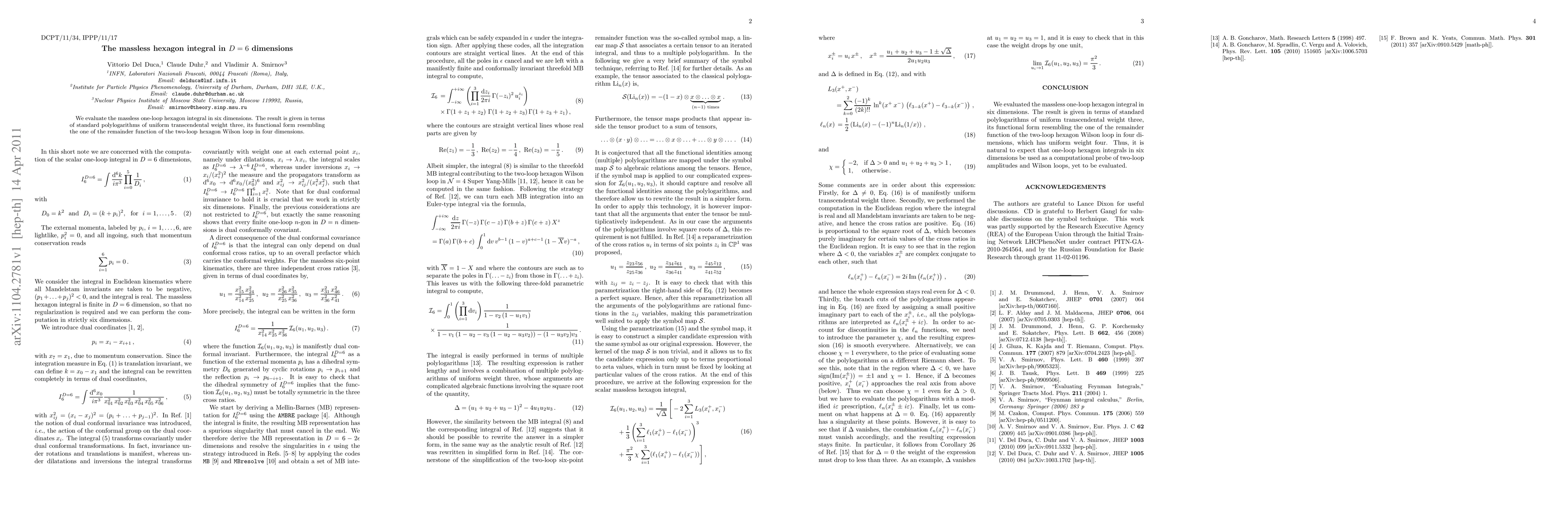 We evaluate the massless one-loop hexagon integral in six dimensions. The result is given in terms of standard polylogarithms of uniform transcendental weight three, its functional form resembling the one of the remainder function of the two-loop hexagon Wilson loop in four dimensions.