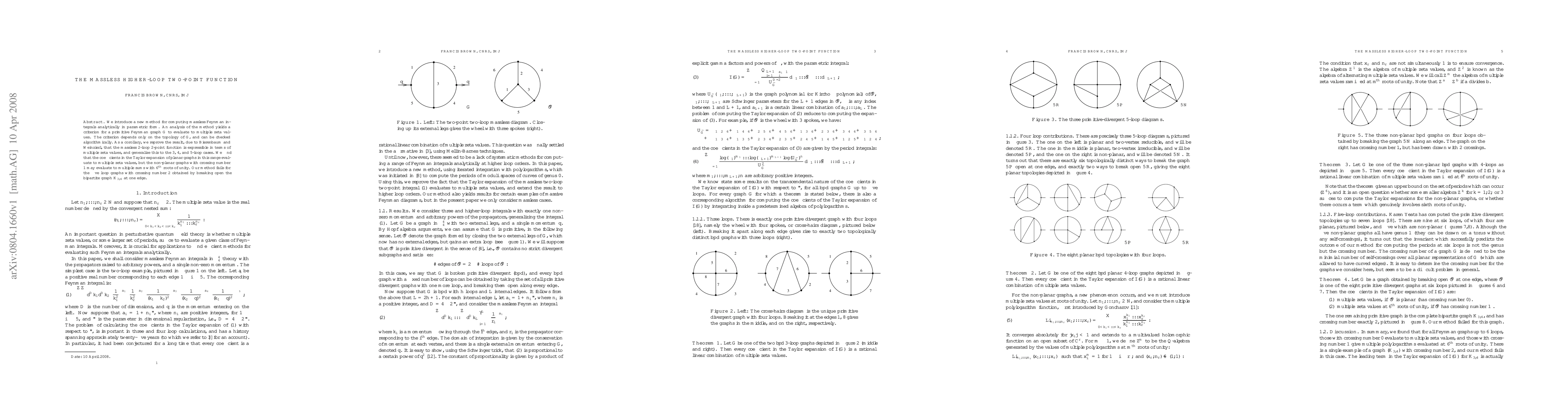 This paper presents a novel analytical method for computing massless Feynman integrals, revealing a criterion for evaluating primitive Feynman graphs in terms of multiple zeta values based on their topology. It generalizes previous results for 2-loop functions to 3-5 loops, showing that planar graphs yield multiple zeta values, while some non-planar graphs may involve multiple sums with sixth roots of unity.