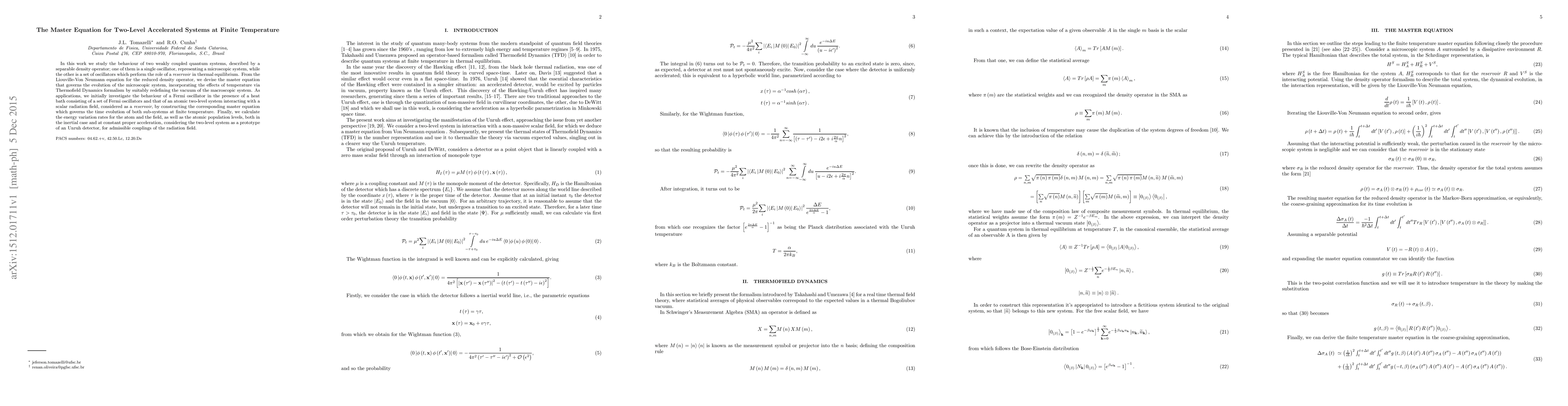 This paper develops a master equation for two-level quantum systems under finite temperature, using Thermofield Dynamics to incorporate thermal effects. It applies the formalism to Fermi oscillators and atomic systems interacting with a scalar radiation field, calculating energy variation rates and atomic population levels under both inertial and accelerated conditions.