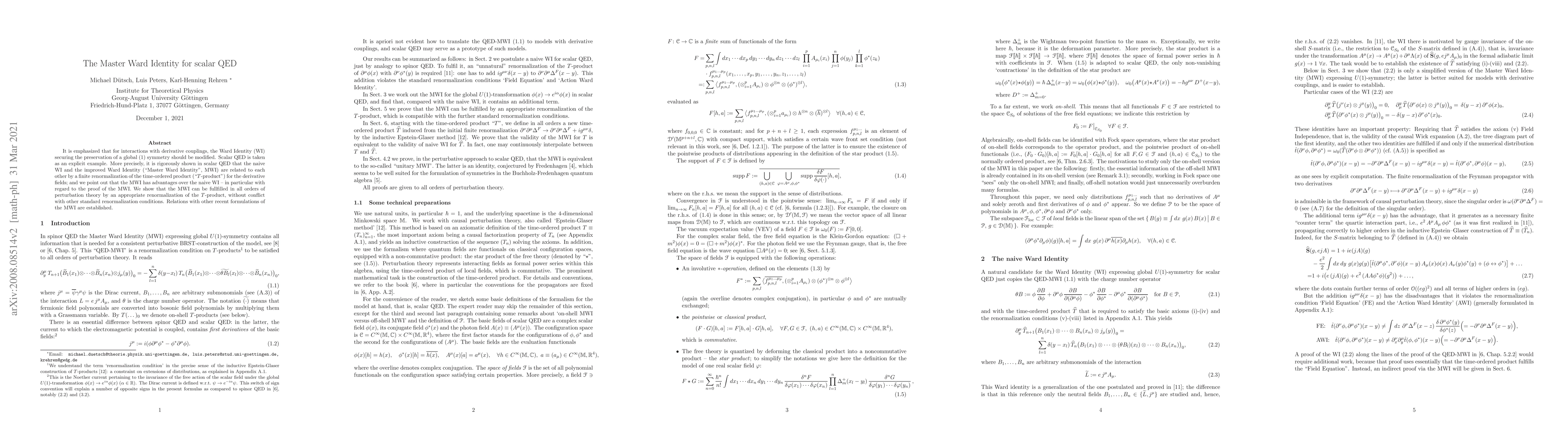 This paper demonstrates that the Master Ward Identity (MWI) in scalar QED, a modified Ward Identity for derivative couplings, is rigorously related to the naive Ward Identity through a finite renormalization of time-ordered products. The MWI offers advantages, particularly in its fulfillment in all perturbation theory orders without conflicting with standard renormalization conditions.