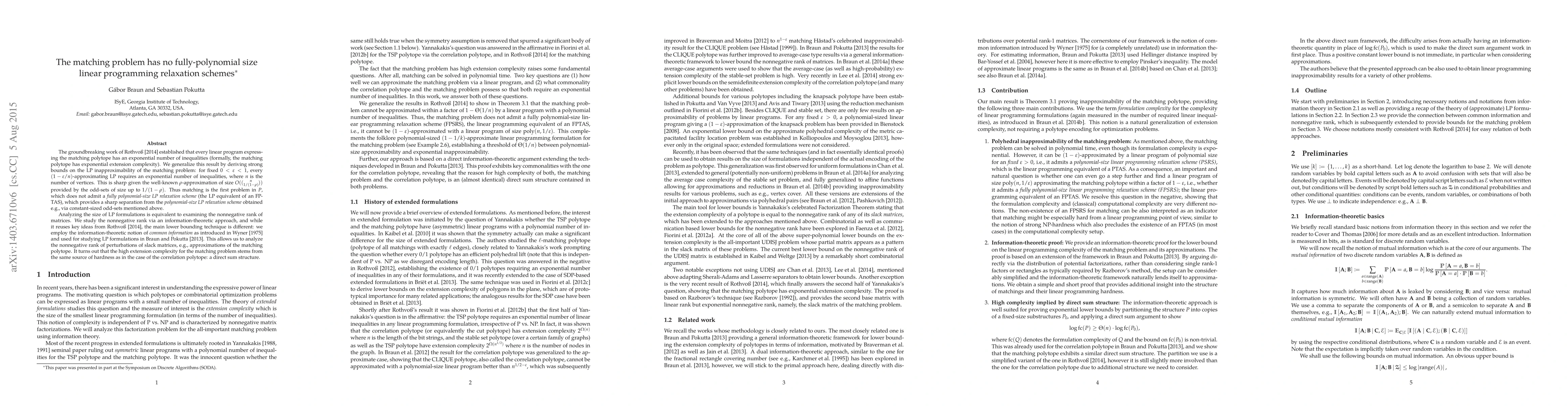 The groundbreaking work of Rothvo{\ss} [arxiv:1311.2369] established that every linear program expressing the matching polytope has an exponential number of inequalities (formally, the matching polytope has exponential extension complexity). We generalize this result by deriving strong bounds on the polyhedral inapproximability of the matching polytope: for fixed $0 < \varepsilon < 1$, every polyhedral $(1 + \varepsilon / n)$-approximation requires an exponential number of inequalities, where $n$ is the number of vertices. This is sharp given the well-known $\rho$-approximation of size $O(\binom{n}{\rho/(\rho-1)})$ provided by the odd-sets of size up to $\rho/(\rho-1)$. Thus matching is the first problem in $P$, whose natural linear encoding does not admit a fully polynomial-size relaxation scheme (the polyhedral equivalent of an FPTAS), which provides a sharp separation from the polynomial-size relaxation scheme obtained e.g., via constant-sized odd-sets mentioned above. Our approach reuses ideas from Rothvo{\ss} [arxiv:1311.2369], however the main lower bounding technique is different. While the original proof is based on the hyperplane separation bound (also called the rectangle corruption bound), we employ the information-theoretic notion of common information as introduced in Braun and Pokutta [http://eccc.hpi-web.de/report/2013/056/], which allows to analyze perturbations of slack matrices. It turns out that the high extension complexity for the matching polytope stem from the same source of hardness as for the correlation polytope: a direct sum structure.