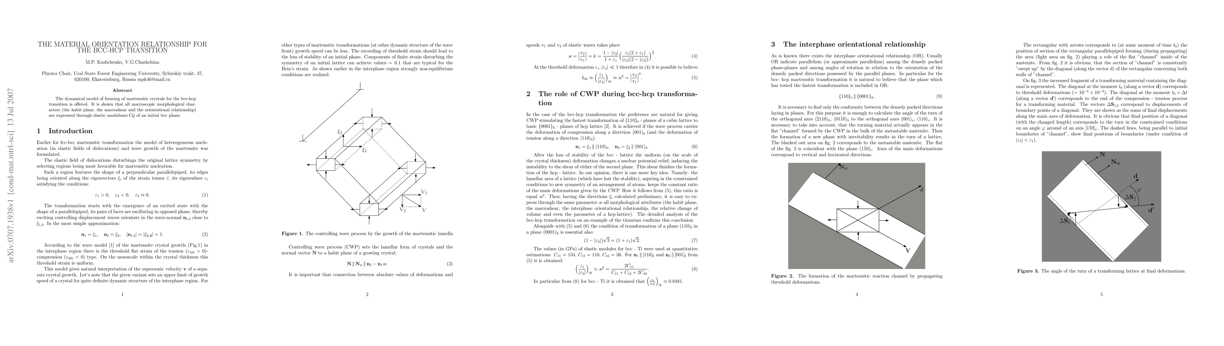 This paper proposes a dynamical model for the martensitic transformation from body-centered cubic (bcc) to hexagonal close-packed (hcp) crystals, demonstrating that macroscopic morphological features are determined by the elastic moduluses of the initial bcc phase. The study elucidates the material orientation relationship for this transition.