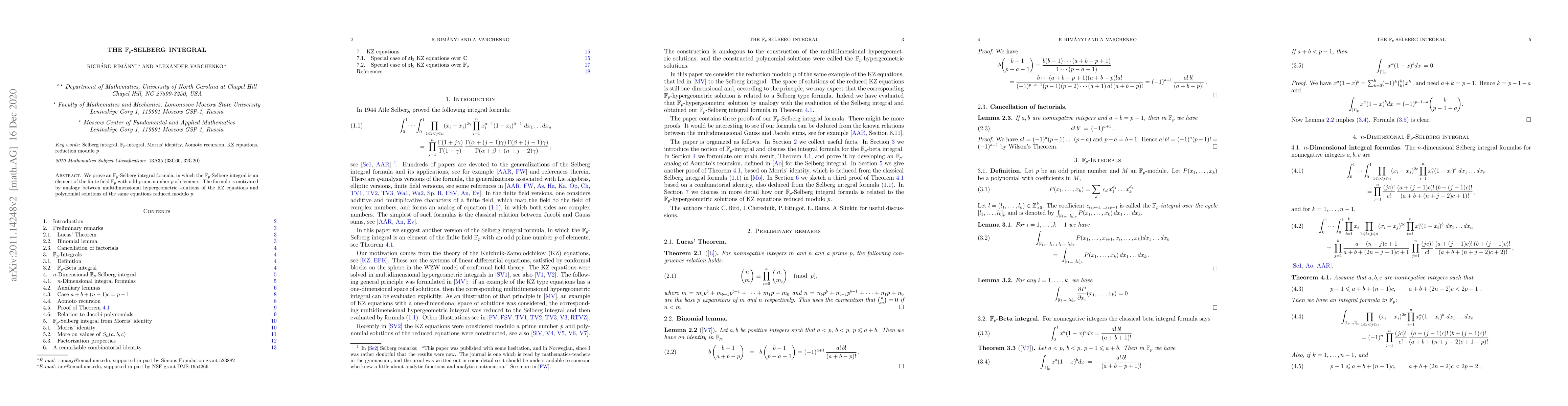 The paper establishes an $\mathbb F_p$-Selberg integral formula, drawing parallels between multidimensional hypergeometric solutions of KZ equations and polynomial solutions reduced modulo an odd prime $p$. This integral extends classical Selberg integrals into the realm of finite fields.