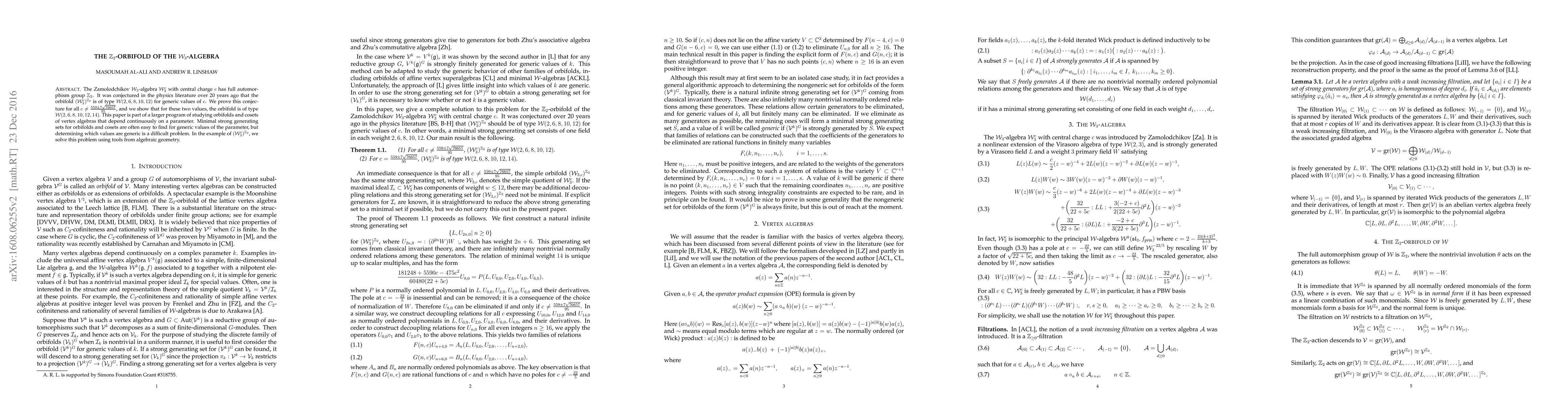 The Zamolodchikov $\mathcal{W}_3$-algebra $\mathcal{W}^c_3$ with central charge $c$ has full automorphism group $\mathbb{Z}_2$. It was conjectured in the physics literature over 20 years ago that the orbifold $(\mathcal{W}^c_3)^{\mathbb{Z}_2}$ is of type $\mathcal{W}(2,6,8,10,12)$ for generic values of $c$. We prove this conjecture for all $c \neq \frac{559 \pm 7 \sqrt{76657}}{95}$, and we show that for these two values, the orbifold is of type $\mathcal{W}(2,6,8,10,12,14)$. This paper is part of a larger program of studying orbifolds and cosets of vertex algebras that depend continuously on a parameter. Minimal strong generating sets for orbifolds and cosets are often easy to find for generic values of the parameter, but determining which values are generic is a difficult problem. In the example of $(\mathcal{W}^c_3)^{\mathbb{Z}_2}$, we solve this problem using tools from algebraic geometry.