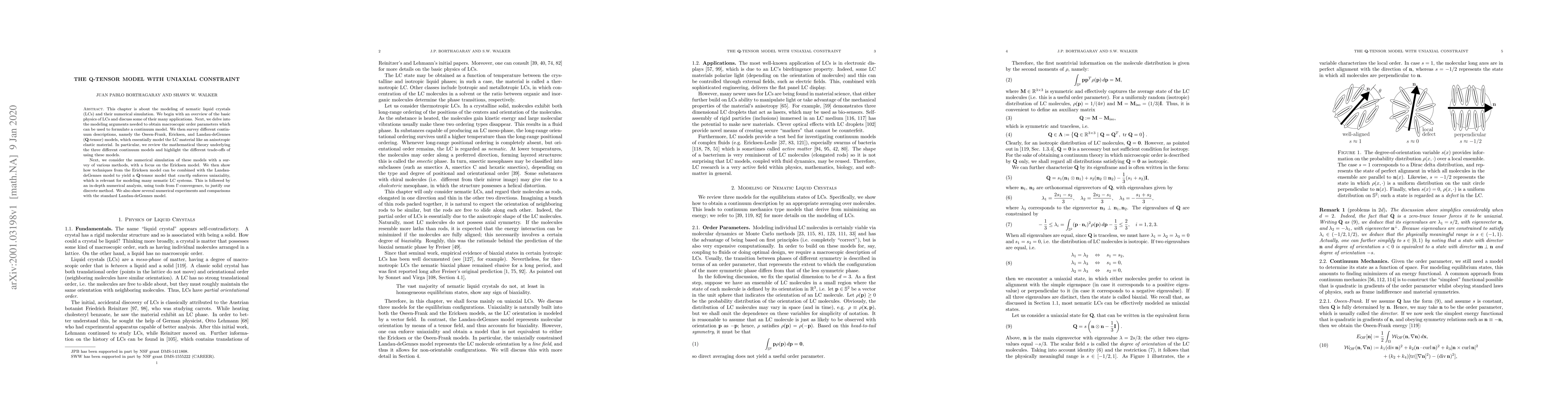 This chapter is about the modeling of nematic liquid crystals (LCs) and their numerical simulation. We begin with an overview of the basic physics of LCs and discuss some of their many applications. Next, we delve into the modeling arguments needed to obtain macroscopic order parameters which can be used to formulate a continuum model. We then survey different continuum descriptions, namely the Oseen-Frank, Ericksen, and Landau-deGennes ($\mathbf{Q}$-tensor) models, which essentially model the LC material like an anisotropic elastic material. In particular, we review the mathematical theory underlying the three different continuum models and highlight the different trade-offs of using these models. Next, we consider the numerical simulation of these models with a survey of various methods, with a focus on the Ericksen model. We then show how techniques from the Ericksen model can be combined with the Landau-deGennes model to yield a $\mathbf{Q}$-tensor model that exactly enforces uniaxiality, which is relevant for modeling many nematic LC systems. This is followed by an in-depth numerical analysis, using tools from $\Gamma$-convergence, to justify our discrete method. We also show several numerical experiments and comparisons with the standard Landau-deGennes model.
