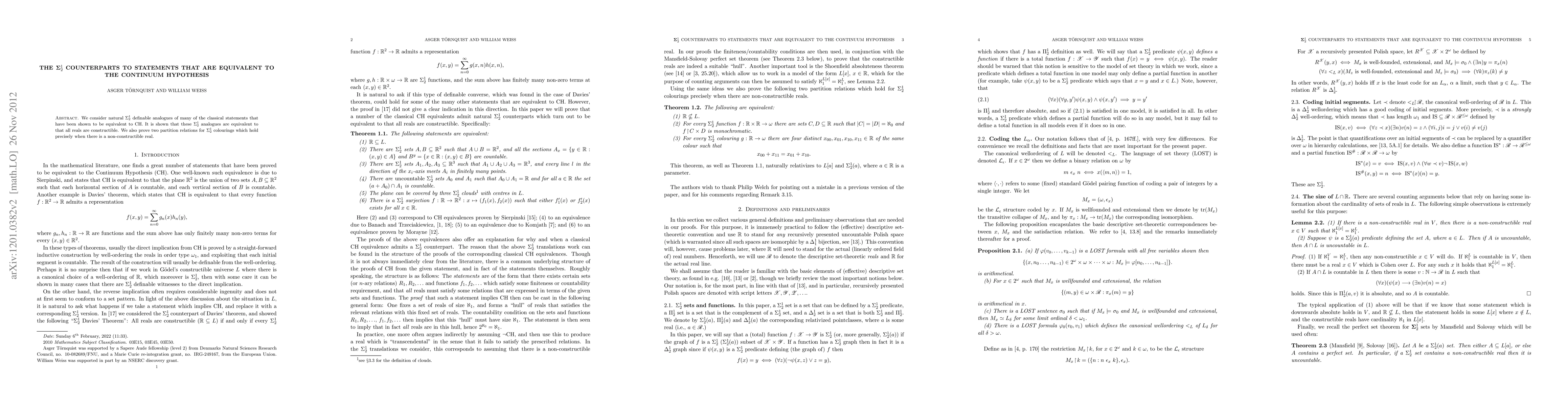 This paper explores $\Sigma^1_2$ definable statements analogous to those equivalent to the Continuum Hypothesis (CH), demonstrating their equivalence to the constructibility of all reals. Additionally, it proves two partition relations for $\Sigma^1_2$ colorings that hold only when there exists a non-constructible real.