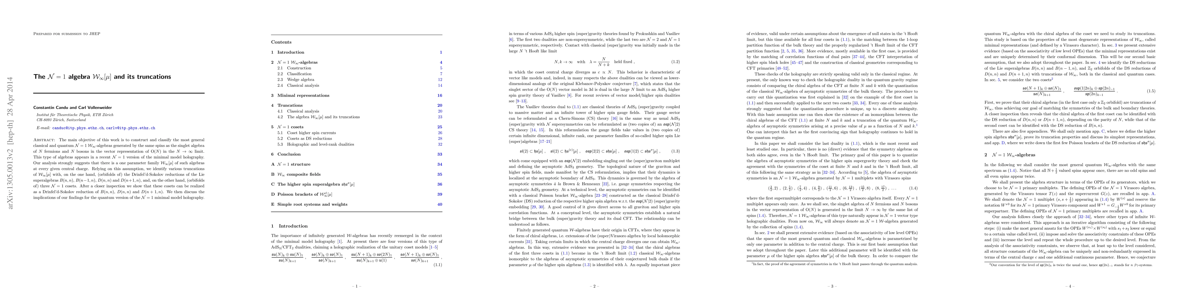 This paper constructs and classifies $\mathcal{N}=1$ $\mathcal{W}_\infty$-algebras, identifying a one-parameter family $\mathcal{W}_\infty[\mu]$ of these algebras. It explores truncations linked to Drinfel'd-Sokolov reductions of certain Lie superalgebras and $\mathcal{N}=1$ cosets, revealing implications for $\mathcal{N}=1$ minimal model holography.