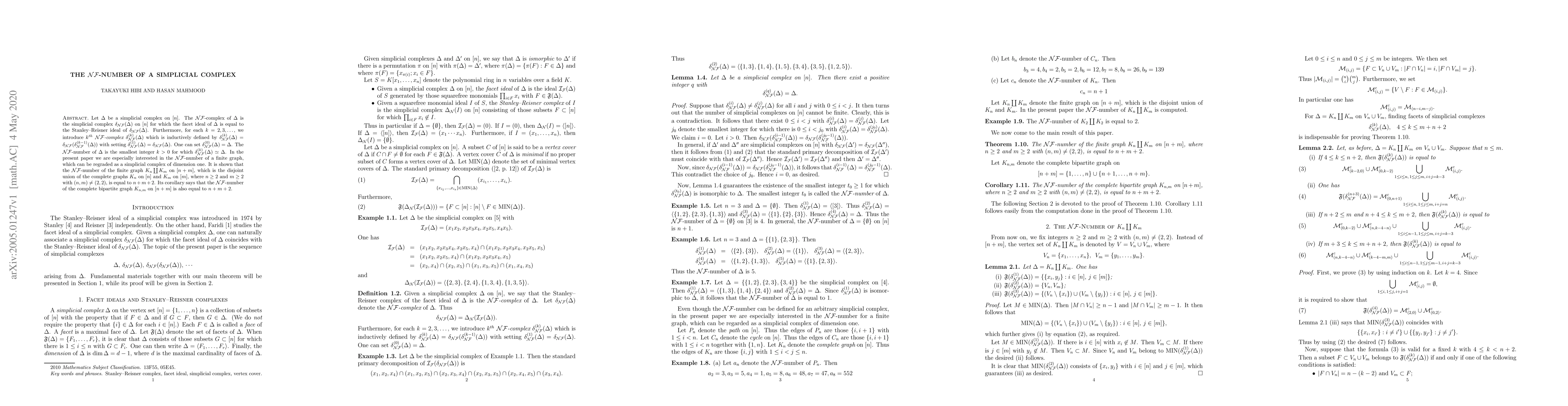 This paper introduces the $\mathcal{N}\mathcal{F}$-complex and $\mathcal{N}\mathcal{F}$-number of a simplicial complex, particularly focusing on finite graphs. It finds that the $\mathcal{N}\mathcal{F}$-number for the disjoint union of complete graphs $K_n\coprod K_m$ is $n + m + 2$, and similarly for the complete bipartite graph $K_{n,m}$.