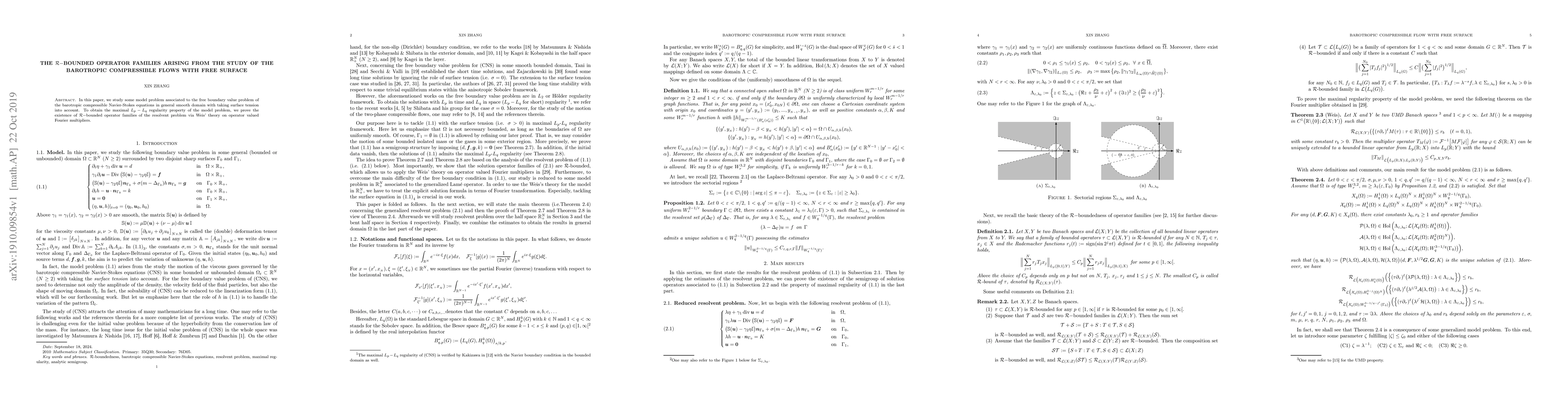 This paper investigates the free boundary value problem for the barotropic compressible Navier-Stokes equations, including surface tension effects. It establishes the maximal $L_p-L_q$ regularity of the model problem by proving the existence of $\mathcal{R}$-bounded operator families for the resolvent problem, utilizing Weis' theory on operator valued Fourier multipliers.