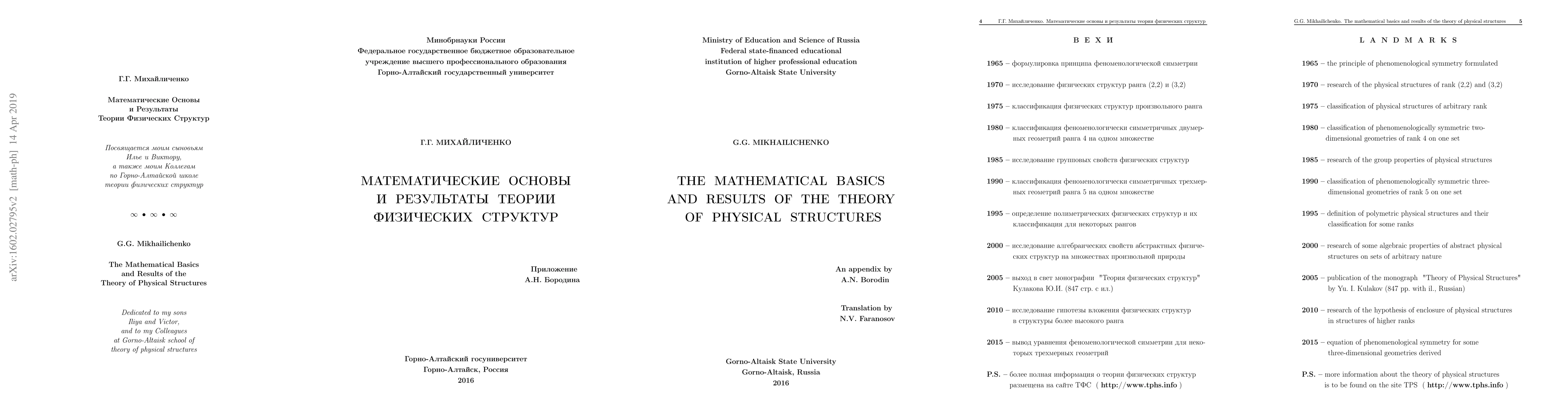 The theory of Physical Structures (TPS) was put forward by Professor Yu.I. Kulakov for the sake of classifying the laws of Physics. The history of the development of that theory is given in his monograph [1]. A physical structure is a geometry of one or two sets whose metric function assigns a number to every pair of points. Its phenomenological symmetry, under Kulakov, means that for every collection of some finite number of points all of their reciprocal distances are functionally related. Such geometries are endowed with a group symmetry under Klein, which is equivalent to the phenomenological symmetry, and many of them have an essential physical interpretation. That is why they are to be defined precisely and explored as purely mathematical objects. In this monograph we treat the mathematical basics of the TPS and present the results of attempts at classification that have been obtained by now. We hope that the monograph will be of interest for research workers and teachers, senior and post graduate students, as well as to all those interested in algebra, geometry and theoretical physics who would like to use the TPS in their research projects or could want to contribute to the development of its mathematical apparatus.