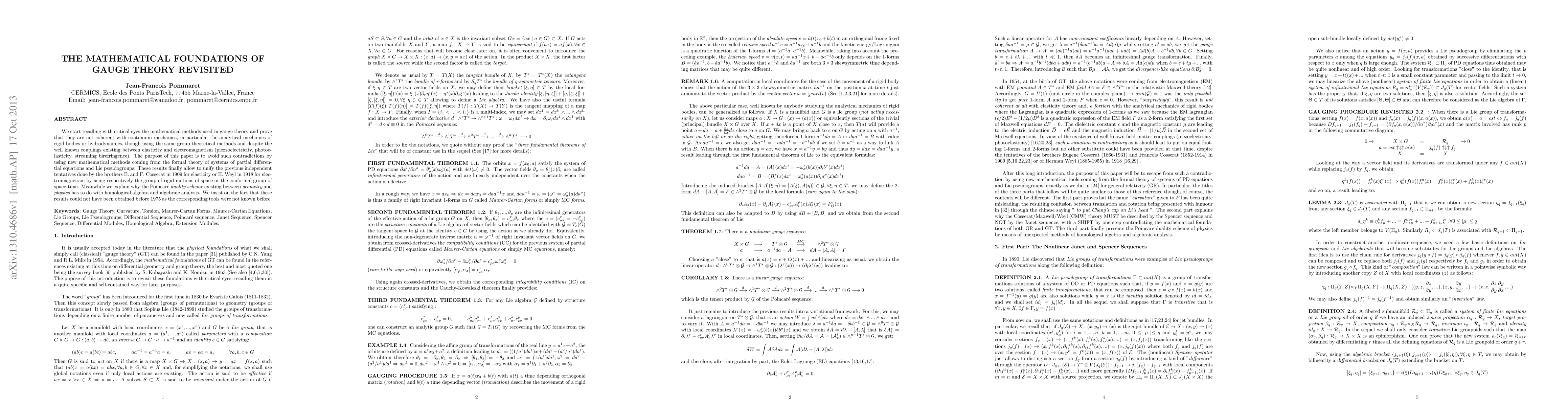 This paper revisits gauge theory's mathematical foundations, finding inconsistencies with continuum mechanics and proposing new methods from formal theory of systems of partial differential equations and Lie pseudogroups to unify elasticity and electromagnetism.