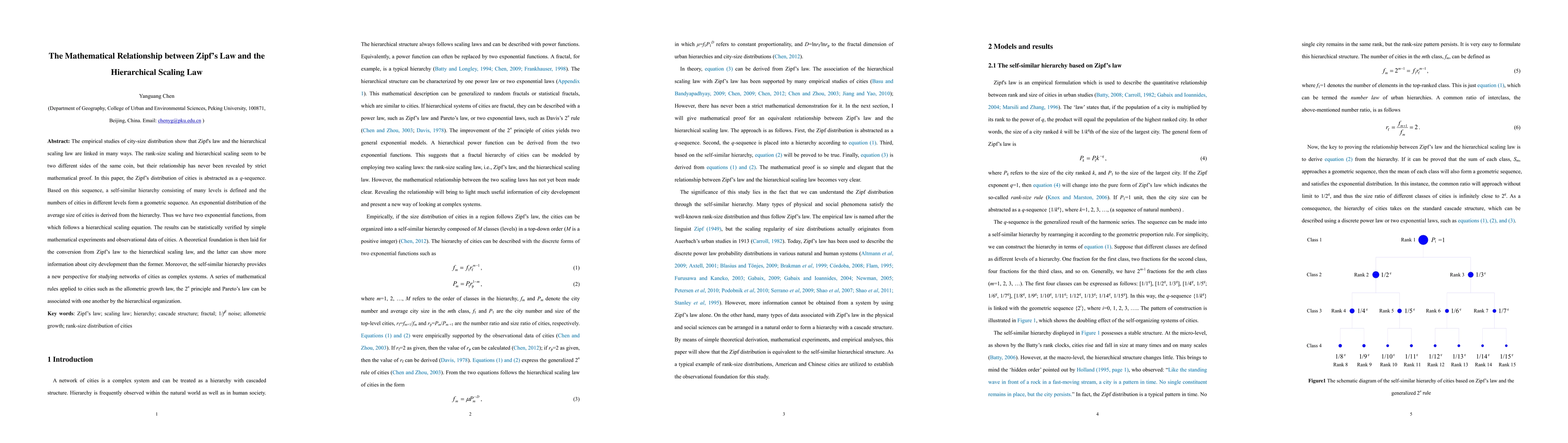 This paper establishes a mathematical relationship between Zipf's law and the hierarchical scaling law, demonstrating that the city-size distribution follows a self-similar hierarchy leading to an exponential distribution of average city sizes, thus providing a theoretical foundation for the conversion from Zipf's law to hierarchical scaling.