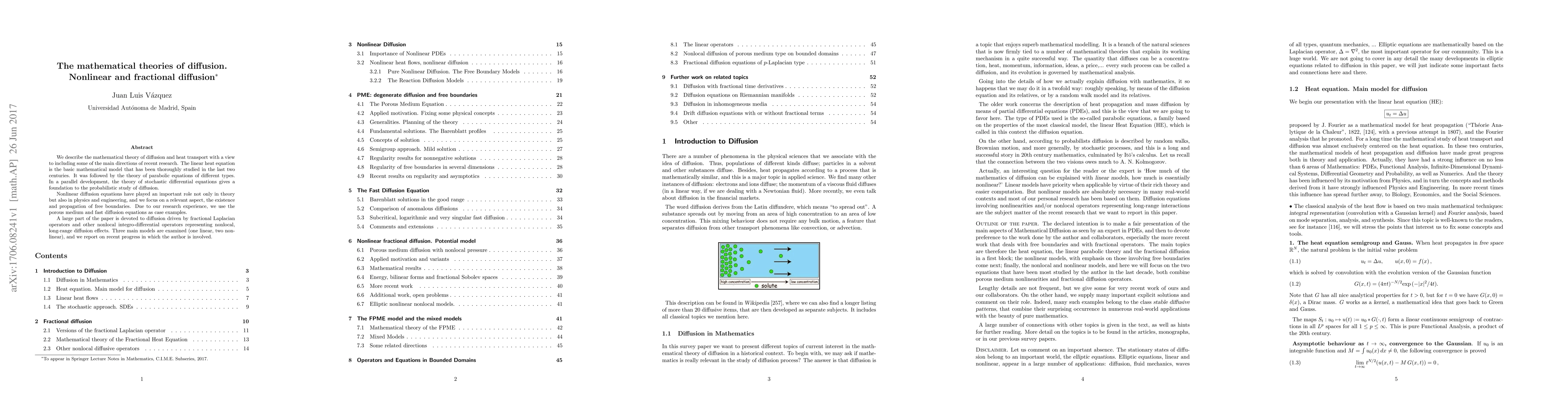 This paper explores advanced mathematical theories of diffusion, including nonlinear and fractional diffusion models. It highlights recent research on the existence and propagation of free boundaries in nonlinear diffusion equations and examines diffusion driven by fractional Laplacian operators, reporting on significant progress in these areas.