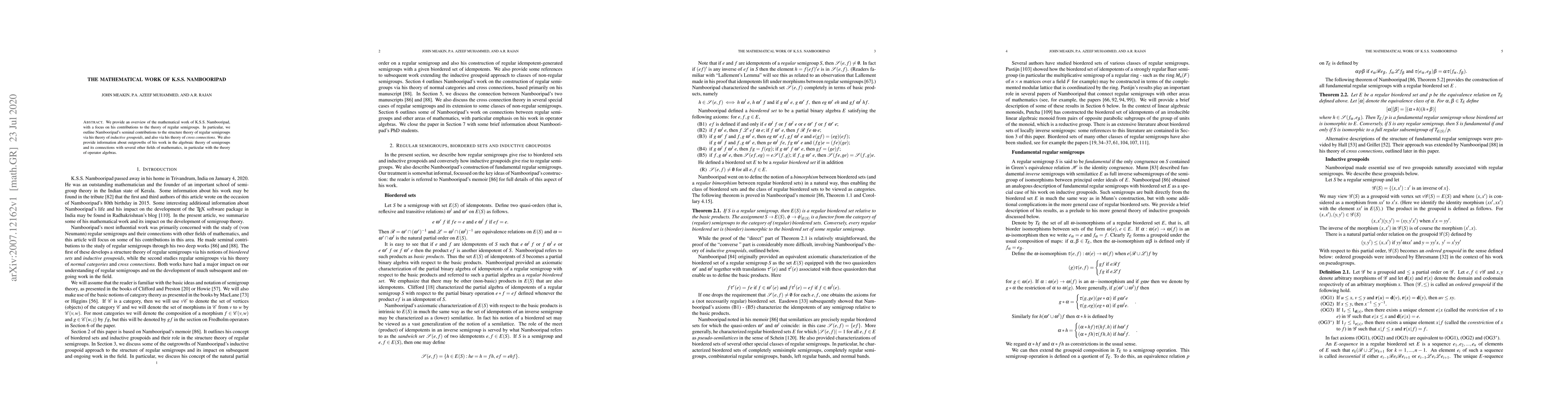 We provide an overview of the mathematical work of K.S.S. Nambooripad, with a focus on his contributions to the theory of regular semigroups. In particular, we outline Nambooripad's seminal contributions to the structure theory of regular semigroups via his theory of {\em inductive groupoids}, and also via his theory of {\em cross connections}. We also provide information about outgrowths of his work in the algebraic theory of semigroups and its connections with several other fields of mathematics, in particular with the theory of operator algebras.
