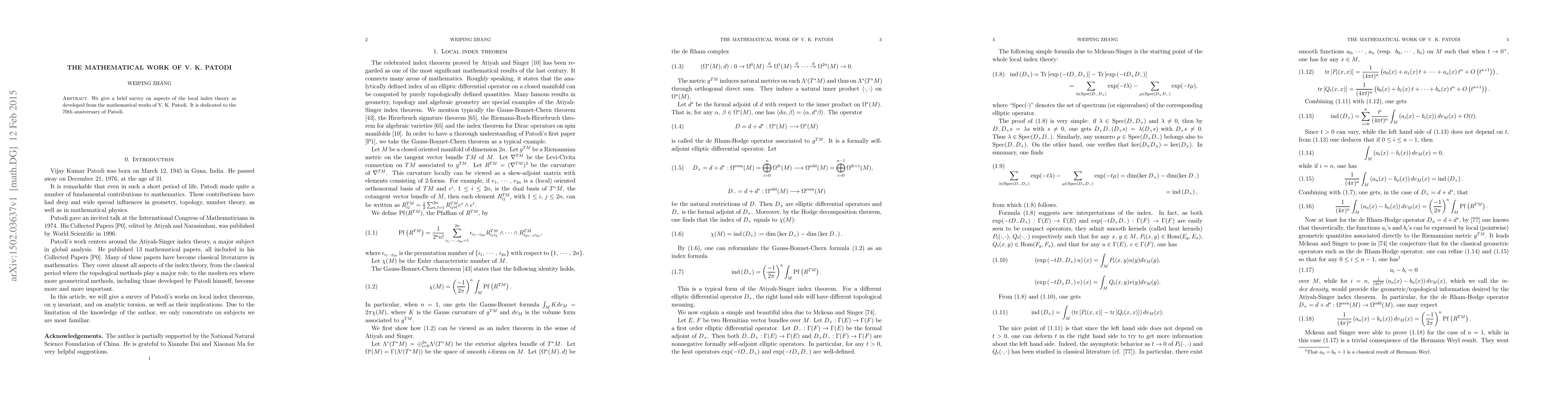Summary: This paper provides a concise overview of V. K. Patodi's contributions to local index theory, celebrating his mathematical legacy on the occasion of his 70th anniversary. It highlights key developments stemming from Patodi's innovative work.