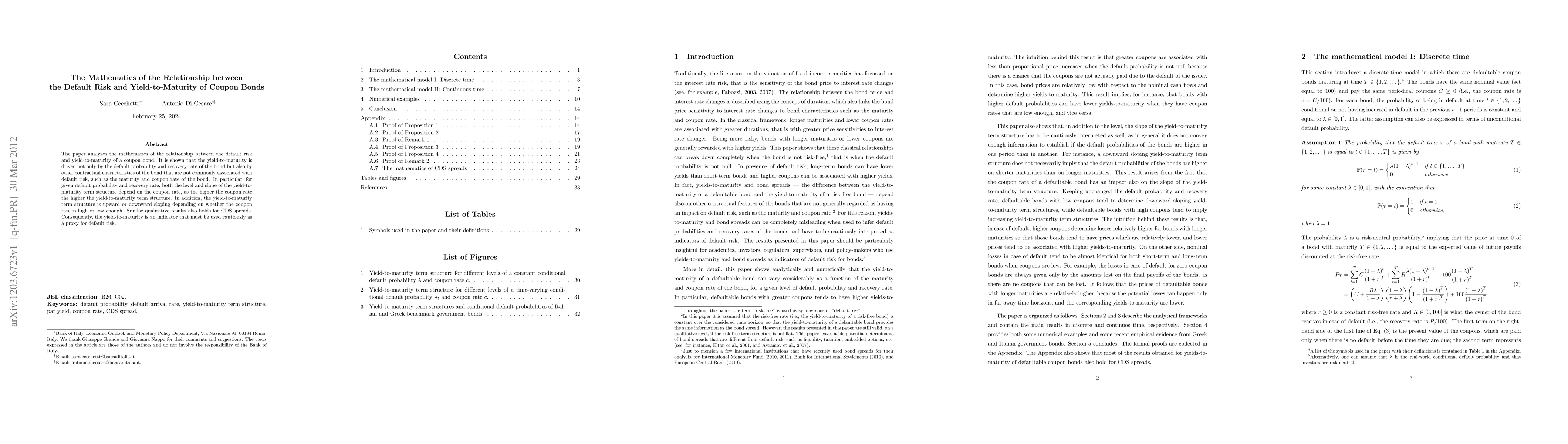 The paper analyzes the mathematics of the relationship between the default risk and yield-to-maturity of a coupon bond. It is shown that the yield-to-maturity is driven not only by the default probability and recovery rate of the bond but also by other contractual characteristics of the bond that are not commonly associated with default risk, such as the maturity and coupon rate of the bond. In particular, for given default probability and recovery rate, both the level and slope of the yield-to-maturity term structure depend on the coupon rate, as the higher the coupon rate the higher the yield-to-maturity term structure. In addition, the yield-to-maturity term structure is upward or downward sloping depending on whether the coupon rate is high or low enough. Similar qualitative results also holds for CDS spreads. Consequently, the yield-to-maturity is an indicator that must be used cautiously as a proxy for default risk.