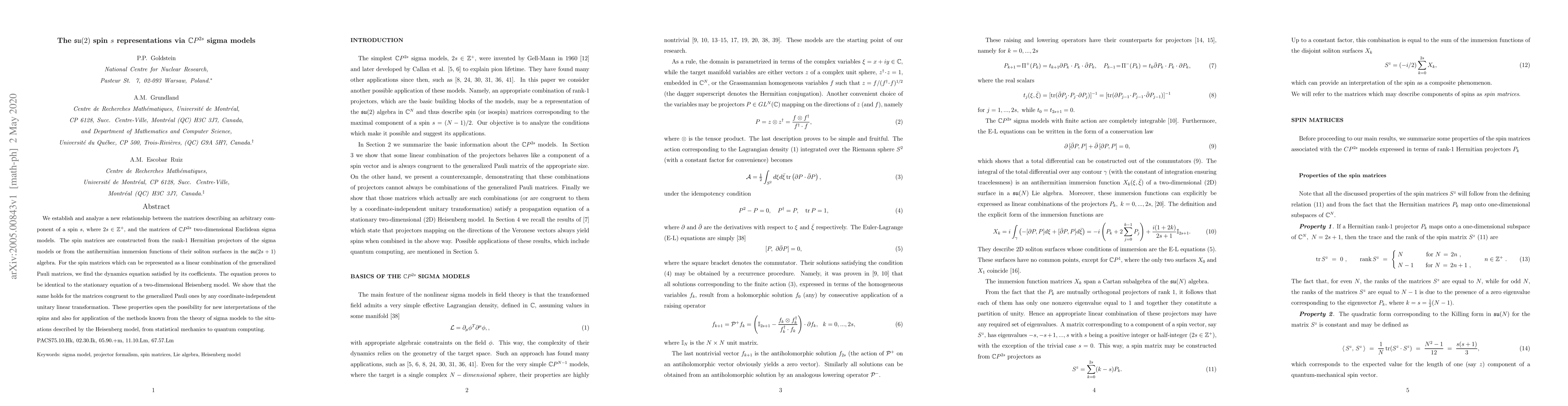 This paper establishes a novel link between spin $s$ representations in $\mathfrak{su}(2)$ and $\mathbb{C}P^{2s}$ sigma models, showing that spin matrices correspond to the Hermitian projectors of sigma models. It also demonstrates that these matrices satisfy a dynamics equation equivalent to the stationary equation of a two-dimensional Heisenberg model, opening new interpretations and applications in statistical mechanics and quantum computing.